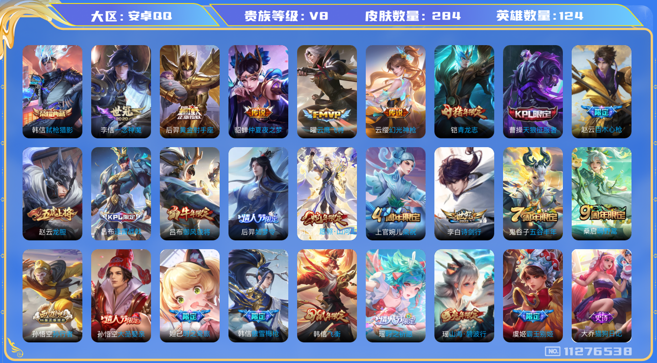 [11276538]V8 1典藏 10传说 124英雄 284皮肤 可修改实名 优质装备:弑枪猎影(韩信典藏),黄金射手座,云鹰飞将(小将军),一念神魔,仲夏夜之梦(大飞蛾) 传说皮:幻光神枪 珍宝阁皮:妄想食味,蔷薇恋人,玩趣恶龙 限定皮:愿照·山河定(司空震年限),逐霄战戟,鸣野蒿,傲雪梅枪,飞衡(韩信年限),山海·碧波行(瑶年限),诗剑行,五谷丰年,青龙志(铠年限),梁祝,御风骁将(吕布年限),龙胆,天狼征服者,如梦令-后羿,霸王别姬-虞姬,孙行者,大圣娶亲,时之祈愿-瑶(瑶传限),百木心枪,时之奇旅-妲己 史诗皮:鸭鸭历险记-刘禅,龙之律动,石田雨龙,茶境仙,破空之剑,战舞者,蔬乡物语(鲁班七号),乘龙·忆丹青(大乔年限),遇见神鹿,电玩小子(小书包),黄金分割率,特工魅影,千年之狐,永昼,百解令(蒙犽),高渐离燃音魔法,偶像歌手,暗夜猫娘,魅语,晚萤,末日机甲-吕布,猫狗日记-孙策,猫狗日记-大乔,时之恋人-孙尚香,乱世虎臣,修罗,女仆咖啡,水果甜心,绅士熊喵,天才门将,星夜王子,心灵骇客,功夫厨神,德古拉伯爵,暗隐猎兽者,幽灵船长,鬼剑武藏,暗渊魔法,心灵战警,天秀·启明,繁星吟游(呼啦呼啦),缤纷独角兽,乘风破浪,逐浪之夏,月团寄思,水晶猎龙者,曙光守护者,金属风暴,圣诞狂欢,鹰眼统帅,暗夜贵公子,魅力维加斯,未来纪元-赵云