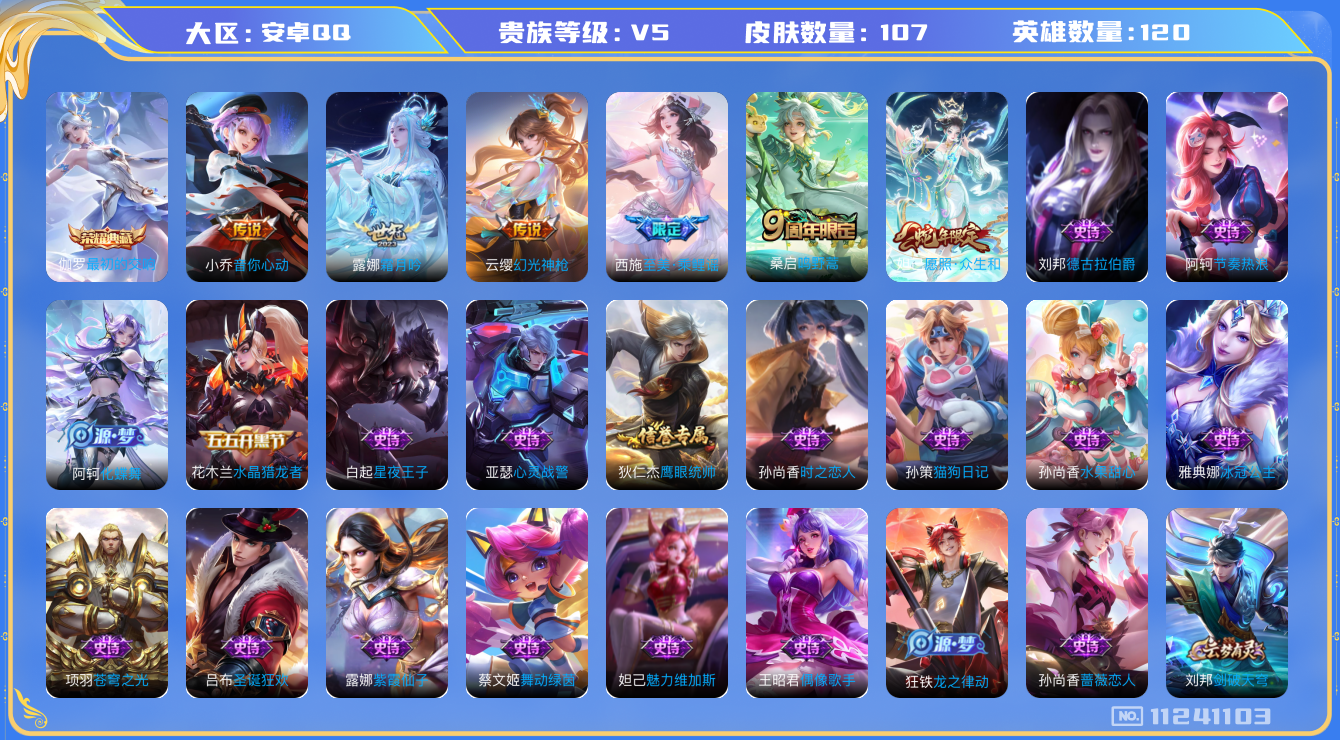 [11241103]V5 1典藏 5传说 120英雄 107皮肤 可修改实名 优质装备:最初的交响(伽罗典藏),音你心动-小乔,霜月吟 传说皮:幻光神枪 珍宝阁皮:蔷薇恋人 限定皮:愿照·众生和(妲己年限),鸣野蒿,至美·乘鲤谣 史诗皮:化蝶舞,龙之律动,紫霞仙子,苍穹之光,偶像歌手,冰冠公主,猫狗日记-孙策,时之恋人-孙尚香,节奏热浪,水果甜心,星夜王子,德古拉伯爵,心灵战警,舞动绿茵,水晶猎龙者,圣诞狂欢,鹰眼统帅,魅力维加斯