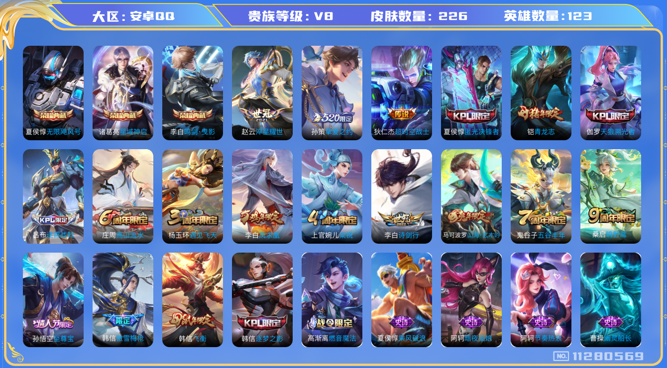 [11280569]V8 3典藏 7传说 123英雄 226皮肤 可修改实名 优质装备:无限飓风号(高达),鸣剑·曳影,星域神启(倪克斯贼亮),淬星耀世,超时空战士-狄仁杰,挚爱之约 珍宝阁皮:妄想食味,优雅恋人 限定皮:逐霄战戟,鸣野蒿,至尊宝,凤求凰(白切鸡),傲雪梅枪,飞衡(韩信年限),遇见飞天,高山流水,诗剑行,匿光决锋者,五谷丰年,青龙志(铠年限),梁祝,天狼溯光者,逐梦之影,山海·玄木吟(马可年限) 史诗皮:百相守梦-周瑜,破空之剑,蔬乡物语(鲁班七号),紫霞仙子,苍穹之光,电玩小子(小书包),白龙吟,特工魅影,永昼,高渐离燃音魔法,偶像歌手,暗夜猫娘,冰冠公主,青蛇,末日机甲-吕布,乱世虎臣,节奏热浪,修罗,女仆咖啡,摇滚巨星,水果甜心,绅士熊喵,天才门将,星夜王子,心灵骇客,功夫厨神,暗隐猎兽者,幽灵船长,鬼剑武藏,心灵战警,拒霜思,缤纷独角兽,乘风破浪,逐浪之夏,水晶猎龙者,金属风暴,圣诞狂欢,圣诞恋歌,鹰眼统帅,魅力维加斯,未来纪元-赵云