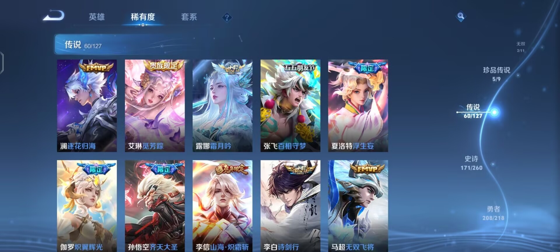 夏侯惇匿光决锋者,夏侯惇霜北刀,黄忠烈魂,老夫子圣诞老人,盾山梦圆繁星,孙尚香异界灵契,牛魔奔雷神使,露娜启示之音,露娜一生所爱,诸葛亮时雨天司,司空震愿照·山河定,裴擒虎李小龙,裴擒虎天狼狩猎者,裴擒虎寅虎·赤拳,上官婉儿梁祝,花木兰默契交锋,马可波罗山海·玄木吟,猪八戒猪悟能,芈月白晶晶,孙悟空至尊宝,雅典娜神奇女侠,韩信飞衡,澜愿照·九州拓,虞姬霸王别姬,虞姬愿照·岁时盈,王昭君映山客,大乔白鹤梁神女,铠青龙志,伽罗天狼溯光者,伽罗太华,孙膑天狼运算者,吕布御风骁将,后羿如梦令,兰陵王默契交锋,公孙离祈雪灵祝,李白诗剑行,艾琳陌上桑,桑启鸣野蒿,女娲愿照·千秋盛,百里玄策白虎志,赵云引擎之心,盘古冰霜神祇,妲己愿照·众生和,蔡文姬愿照·福禄聚,关羽武圣,关羽冰锋战神