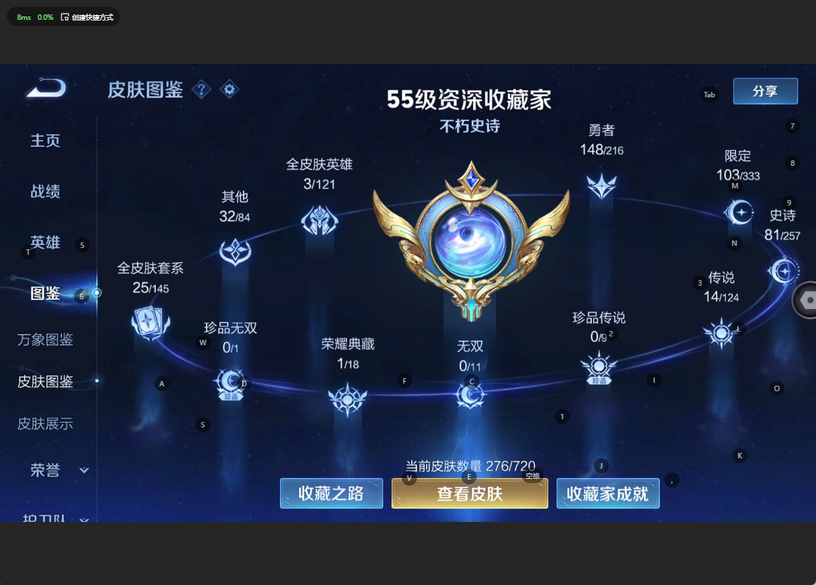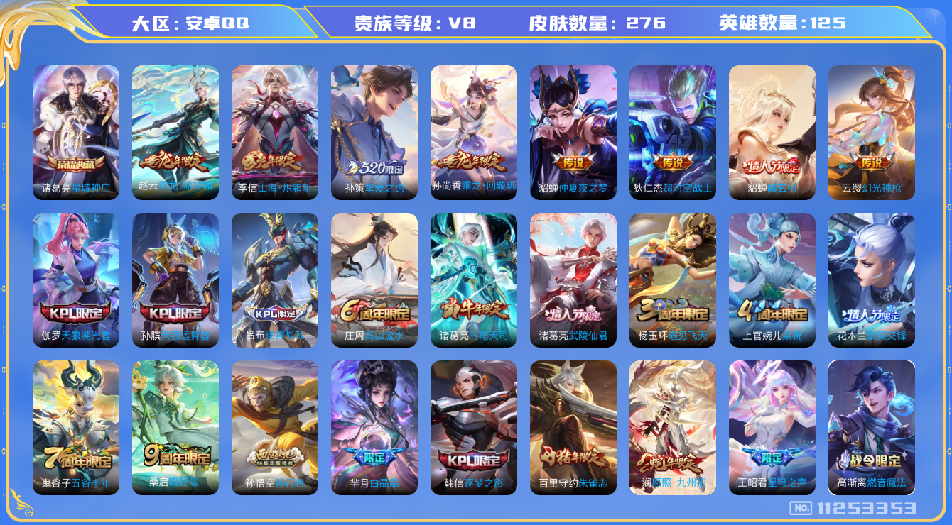 [11253353]V8 1典藏 14传说 125英雄 276皮肤 可修改实名 荣耀水晶:星域神启(倪克斯贼亮) 传说皮:乘龙·问璇玑(孙尚香年限),乘龙·铭钟鼎(赵云年限),貂蝉曦玄引,幻光神枪,山海·炽霜斩(李信年限),仲夏夜之梦(大飞蛾),超时空战士-狄仁杰,挚爱之约 珍宝阁皮:优雅恋人,蔷薇恋人,女武神 限定皮:愿照·九州拓(澜年限),逐霄战戟,鸣野蒿,武陵仙君(小桃花),星穹之声,白晶晶,时雨天司(水龙头),遇见飞天,高山流水,五谷丰年,天狼运算者,梁祝,天狼溯光者,逐梦之影,朱雀志(守约年限),默契交锋-花木兰,孙行者 史诗皮:茶境仙,器灵·浮梦炉,鸭鸭历险记-刘禅,龙之律动,石田雨龙,百相守梦-百里守约,蔬乡物语(鲁班七号),化蝶舞,破空之剑,苍穹之光,电玩小子(小书包),黄金分割率,特工魅影,千年之狐,江河有灵,高渐离燃音魔法,百解令(蒙犽),青蛇,偶像歌手,魅语,暗夜猫娘,龙骑士(小龙虾),末日机甲-吕布,猫狗日记-孙策,时之恋人-孙尚香,节奏热浪,女仆咖啡,摇滚巨星,水果甜心,绅士熊喵,时之奇旅-安琪拉,功夫厨神,德古拉伯爵,鬼剑武藏,乐园奇幻夜,天秀·启明,地狱岩魂,纤云弄巧,拒霜思,缤纷独角兽,乘风破浪,逐浪之夏,水晶猎龙者,曙光守护者,热力回旋,唤灵魅影,金属风暴,圣诞狂欢,鹰眼统帅,滕王阁序,无心,未来纪元-赵云