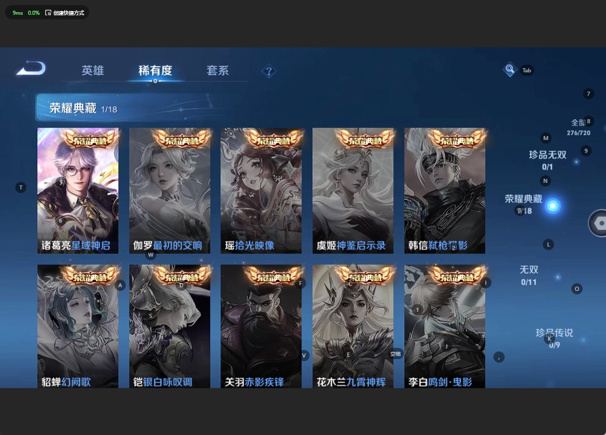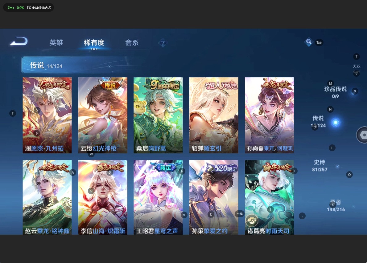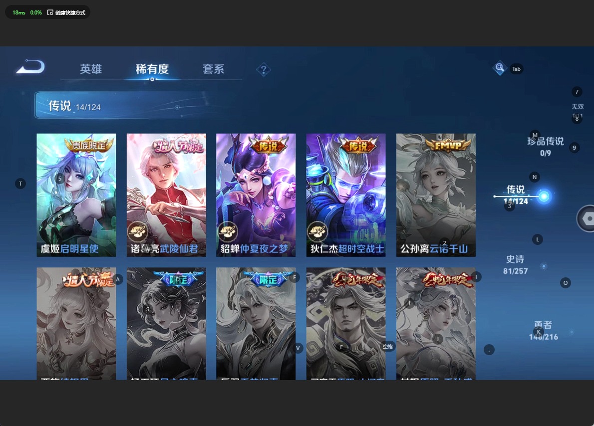 - PX_2106518-Q/至尊星耀/190皮肤/124英雄/1典藏/0珍品无双/0无双/1珍品传说/19传说/49史诗/8稀有英雄 【1 珍品传说】怪盗基德 马可波罗, 【1 典藏皮肤】鸣剑·曳影 李白, 【19 传说皮肤】启明星使 虞姬,碎云 百里守约,电玩·雷克斯 澜,飞鸢探春 李元芳,零号·赤焰 孙悟空,地狱火 孙悟空,云鹰飞将 曜,仲夏夜之梦 貂蝉,记忆之芯 公孙离,霜月吟 露娜,乞巧织情