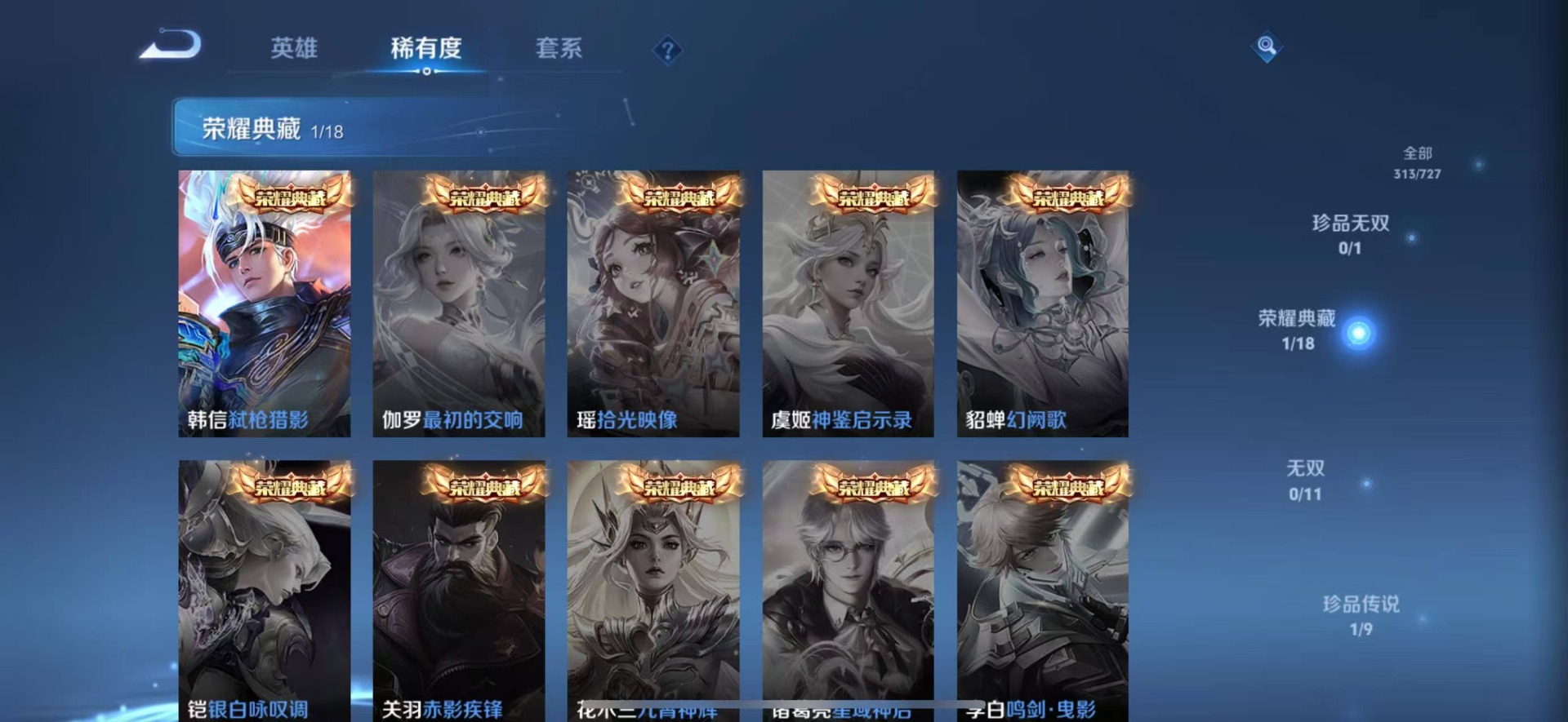 夏侯惇朔风刀,老夫子醍醐杖,沈梦溪大漠名商,苏烈千军破阵,典韦蓝屏警告,达摩沙漠行僧,项羽苍威无极,镜青焰无极,兰陵王金庭之子,裴擒虎擒涛扼浪,鲁班大师探海日志,马可波罗暗影游猎,鬼谷子原初探秘者,张良古海寻踪,桑启海盐诗旅,狄仁杰万华元夜,程咬金演武夺筹,李元芳云中旅人,钟馗驱傩正仪