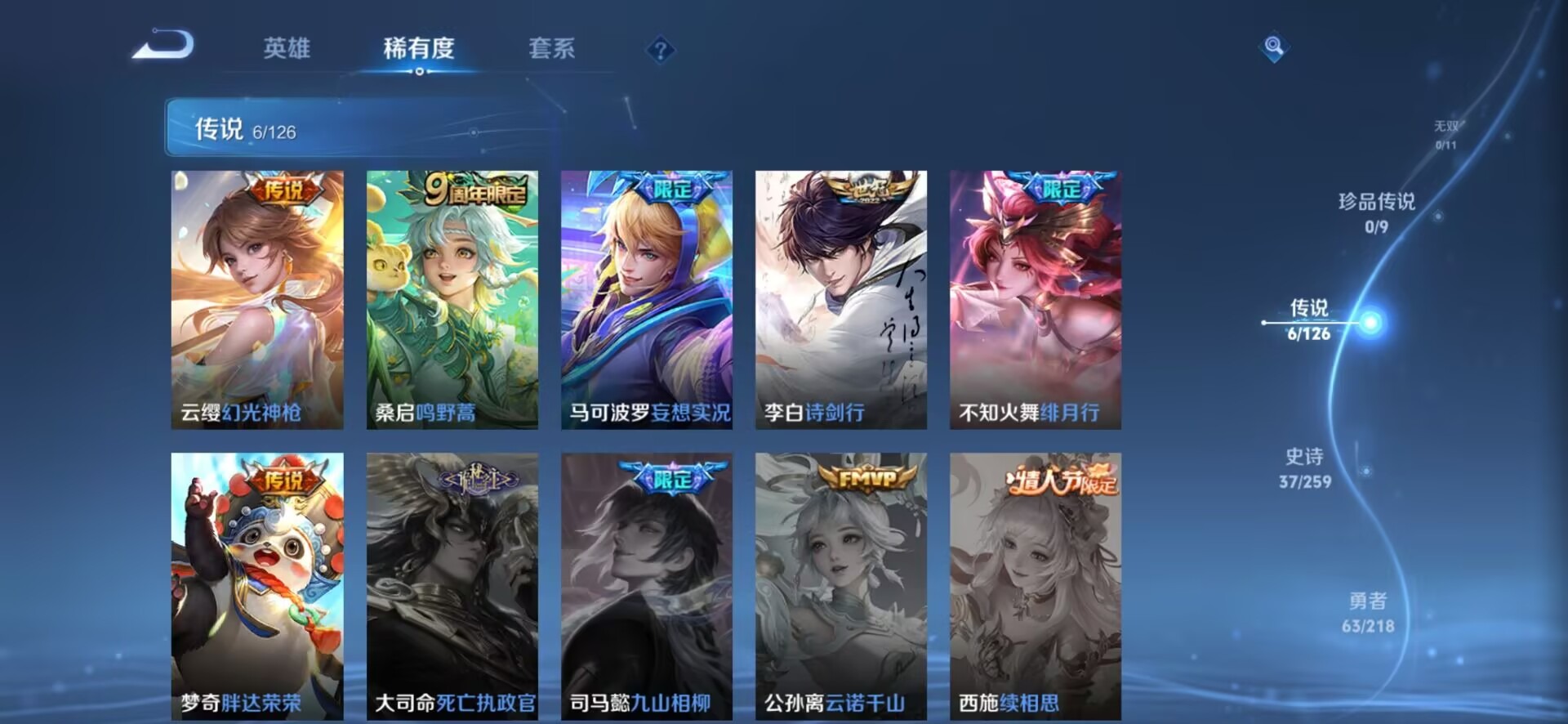 - PX_2108110-??信/至尊星耀/305皮肤/125英雄/2典藏/0珍品无双/0无双/0珍品传说/18传说/85史诗/9稀有英雄 【2 典藏皮肤】鸣剑·曳影 李白,九霄神辉 花木兰, 【18 传说皮肤】枫霜尽 橘右京,启明星使 虞姬,逐花归海 澜,零号·赤焰 孙悟空,云鹰飞将 曜,地狱之眼 宫本武藏,时雨天司 诸葛亮,炽阳神光 镜,时之恋人 刘备,一念神魔 李信,淬星耀世 赵云,绛天战甲 铠