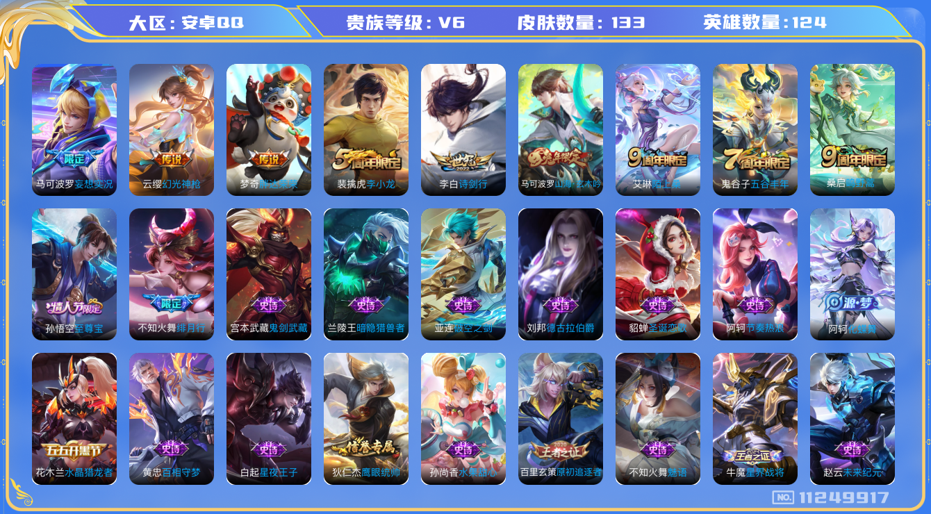 [11249917]V6 6传说 124英雄 133皮肤 可修改实名 优质装备:胖达荣荣,妄想实况 传说皮:幻光神枪 珍宝阁皮:玩趣恶龙 限定皮:陌上桑,鸣野蒿,至尊宝,绯月行,诗剑行,五谷丰年,李小龙,山海·玄木吟(马可年限) 史诗皮:化蝶舞,星界战将,龙之律动,破空之剑,战舞者,百相守梦-黄忠,紫霞仙子,偶像歌手,魅语,末日机甲-吕布,节奏热浪,水果甜心,绅士熊喵,星夜王子,德古拉伯爵,暗隐猎兽者,鬼剑武藏,舞动绿茵,繁星吟游(呼啦呼啦),水晶猎龙者,原初追逐者,圣诞狂欢,圣诞恋歌,鹰眼统帅,无心,未来纪元-赵云
