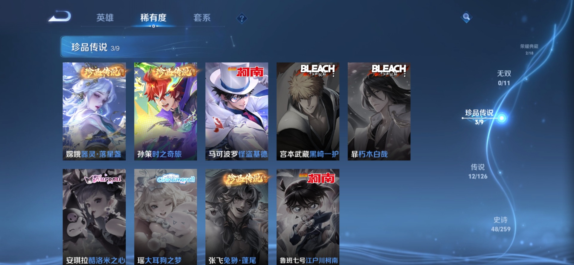 大乔猫狗日记,高渐离燃音魔法,刘邦德古拉伯爵,夏侯惇乘风破浪,阿轲节奏热浪,曹操幽灵船长,伽罗琥珀纪元,小乔缤纷独角兽,孙策猫狗日记,吕布末日机甲,露娜紫霞仙子,宫本武藏鬼剑武藏,兰陵王暗隐猎兽者,李白谪仙醉月,花木兰水晶猎龙者,李白千年之狐,夏洛特永昼,蒙犽百解令,白起星夜王子,嬴政暗夜贵公子,程咬金功夫厨神,百里玄策原初追逐者,李元芳逐浪之夏,墨子金属风暴,蔡文姬舞动绿茵,娜可露露晚萤