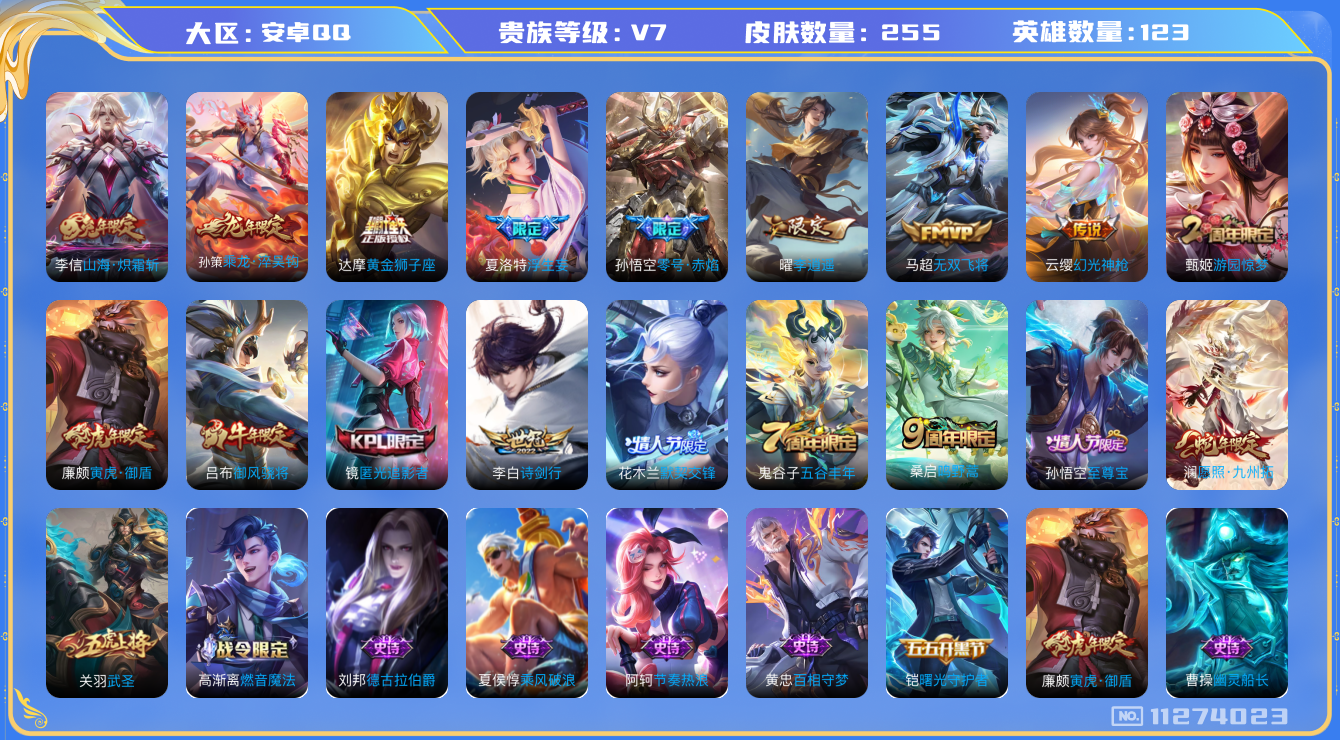 [11274023]V7 12传说 123英雄 255皮肤 可修改实名 优质装备:黄金狮子座,零号·赤焰,李逍遥,无双飞将,山海·炽霜斩(李信年限),浮生妄 传说皮:乘龙·淬吴钩(孙策年限),幻光神枪 珍宝阁皮:妄想食味,蔷薇恋人,女武神 限定皮:愿照·九州拓(澜年限),鸣野蒿,至尊宝,诗剑行,五谷丰年,武圣,游园惊梦,御风骁将(吕布年限),默契交锋-花木兰,匿光追影者,寅虎·御盾(廉颇年限) 史诗皮:鸭鸭历险记-刘禅,星界战将,龙之律动,石田雨龙,东方月初,蒙犽顽岩魄,埋骨钱,百相守梦-黄忠,苍穹之光,电玩小子(小书包),黄金分割率,特工魅影,千年之狐,电玩·爆裂旋风,江河有灵,百解令(蒙犽),高渐离燃音魔法,蒙恬荣光圣徽,偶像歌手,无限星赏官,晚萤,猫狗日记-孙策,时之恋人-孙尚香,乱世虎臣,节奏热浪,修罗,女仆咖啡,摇滚巨星,水果甜心,绅士熊喵,天才门将,星夜王子,功夫厨神,德古拉伯爵,暗隐猎兽者,幽灵船长,鬼剑武藏,天秀·启明,舞动绿茵,地狱岩魂,纤云弄巧,拒霜思,乘风破浪,逐浪之夏,水晶猎龙者,曙光守护者,箭羽风息,金属风暴,原初追逐者,圣诞恋歌,鹰眼统帅,魅力维加斯,黎明之约,赏金猎手,寅虎·御盾,未来纪元-赵云