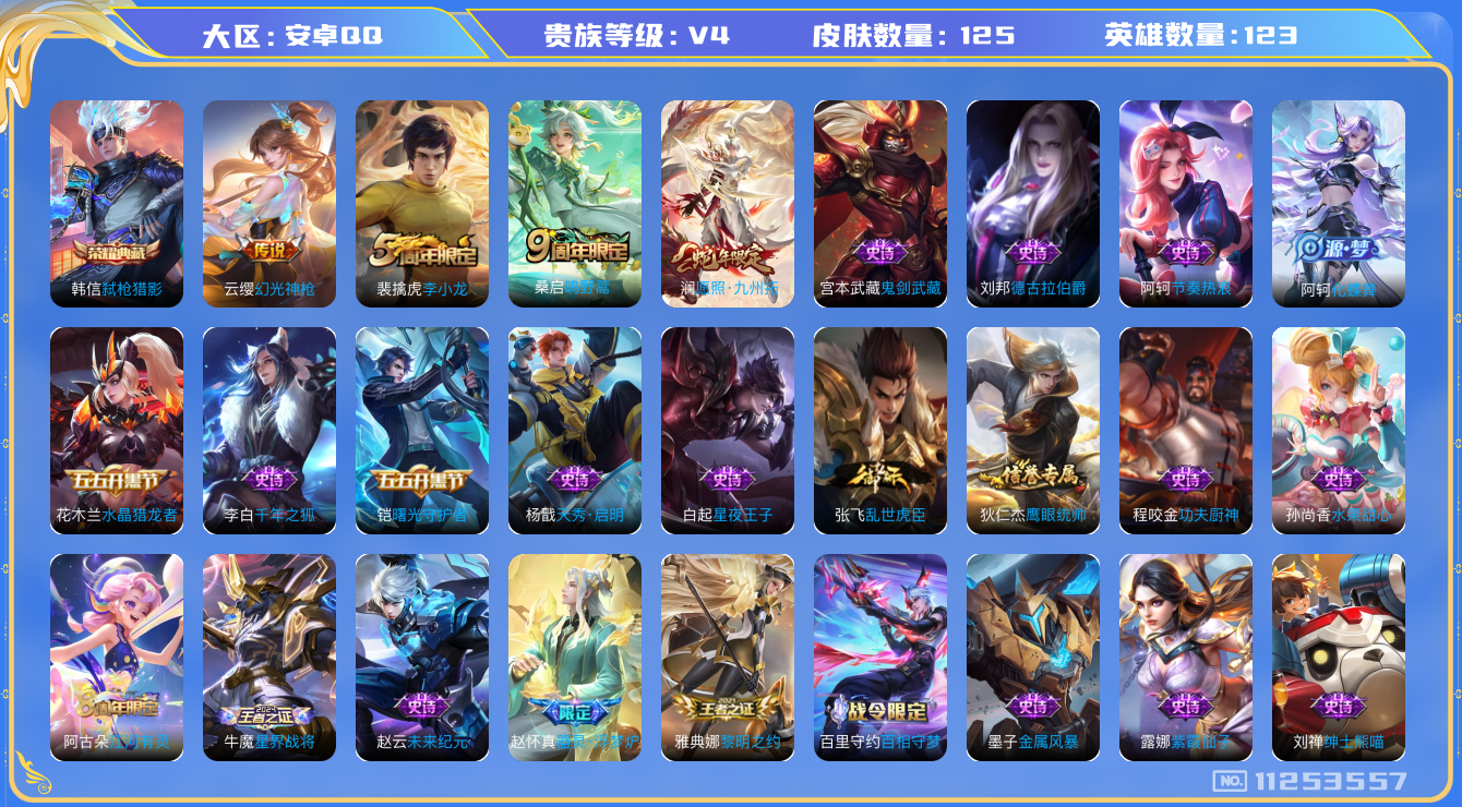 [11253557]V4 1典藏 3传说 123英雄 125皮肤 可修改实名 优质装备:弑枪猎影(韩信典藏) 传说皮:幻光神枪 珍宝阁皮:妄想食味 限定皮:愿照·九州拓(澜年限),鸣野蒿,李小龙 史诗皮:器灵·浮梦炉,化蝶舞,星界战将,龙之律动,百相守梦-百里守约,紫霞仙子,千年之狐,江河有灵,乱世虎臣,节奏热浪,水果甜心,绅士熊喵,星夜王子,功夫厨神,德古拉伯爵,鬼剑武藏,天秀·启明,水晶猎龙者,曙光守护者,金属风暴,鹰眼统帅,黎明之约,未来纪元-赵云