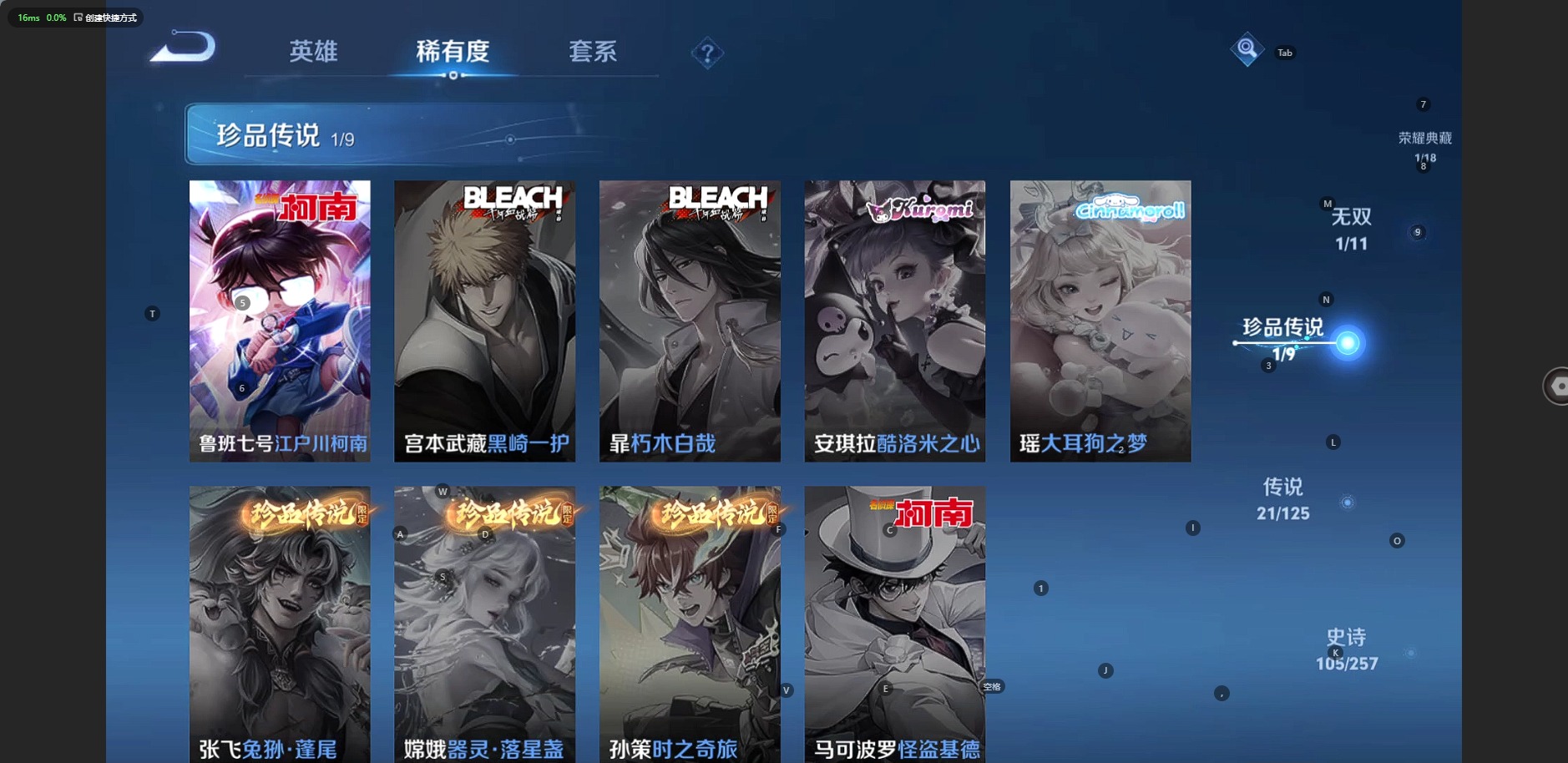 [11282753]V8 1典藏 1无双 1珍品传说 21传说 123英雄 337皮肤 可修改实名 荣耀水晶:鸣剑·曳影 无双皮:韩信群星魔术团(韩信无双) 珍品传说:江户川柯南 传说皮:乘龙·问璇玑(孙尚香年限),乘龙·铭钟鼎(赵云年限),乘龙·淬吴钩(孙策年限),云中君群星魔术团,祥瑞亨通,地狱火,仲夏夜之梦(大飞蛾),一念神魔,云鹰飞将(小将军),时之恋人-刘备(电焊工),超时空战士-狄仁杰,挚爱之约,山海·苍雷引(电光曜子),澜逐花归海 珍宝阁皮:妄想食味,优雅恋人,女武神 限定皮:愿照·九州拓(澜年限),愿照·山河定(司空震年限),逐霄战戟,陌上桑,鸣野蒿,至尊宝,寅虎·展翼(孙膑年限),白晶晶,神威(电光马子),高山流水,无限倾心-虞姬,五谷丰年,武圣,游园惊梦,梁祝,岱宗(典韦年限),天狼绘梦者,李小龙,圣诞老人,默契交锋-花木兰,孙行者,猪悟能,匿光追影者,深海之息(深海大菠萝) 史诗皮:狼魂孤将,上官婉儿群星魔术团,蔬乡物语(鲁班七号),琥珀纪元伽罗,破空之剑,遇见神鹿,紫霞仙子,白龙吟,黄金分割率,特工魅影,千年之狐,永昼,末日机甲-莱西奥,江河有灵,高渐离燃音魔法,雪夜绮愿(周瑜),百解令(蒙犽),蒙恬荣光圣徽,冰冠公主,偶像歌手,无限星赏官,魅语,白蛇,电玩·爆裂旋风,银翎春语,末日机甲-吕布,猫狗日记-孙策,猫狗日记-大乔,乱世虎臣,节奏热浪,修罗,女仆咖啡,摇滚巨星,水果甜心,绅士熊喵,天才门将,星夜王子,心灵骇客,功夫厨神,德古拉伯爵,暗隐猎兽者,幽灵船长,鬼剑武藏,心灵战警,舞动绿茵,地狱岩魂,诗语江南,纤云弄巧,繁星吟游(呼啦呼啦),拒霜思,缤纷独角兽,乘风破浪,逐浪之夏,月团寄思,水晶猎龙者,曙光守护者,箭羽风息,金属风暴,原初追逐者,圣诞狂欢,圣诞恋歌,鹰眼统帅,暗夜贵公子,魅力维加斯,黎明之约,天秀·音浪,无心,未来纪元-赵云