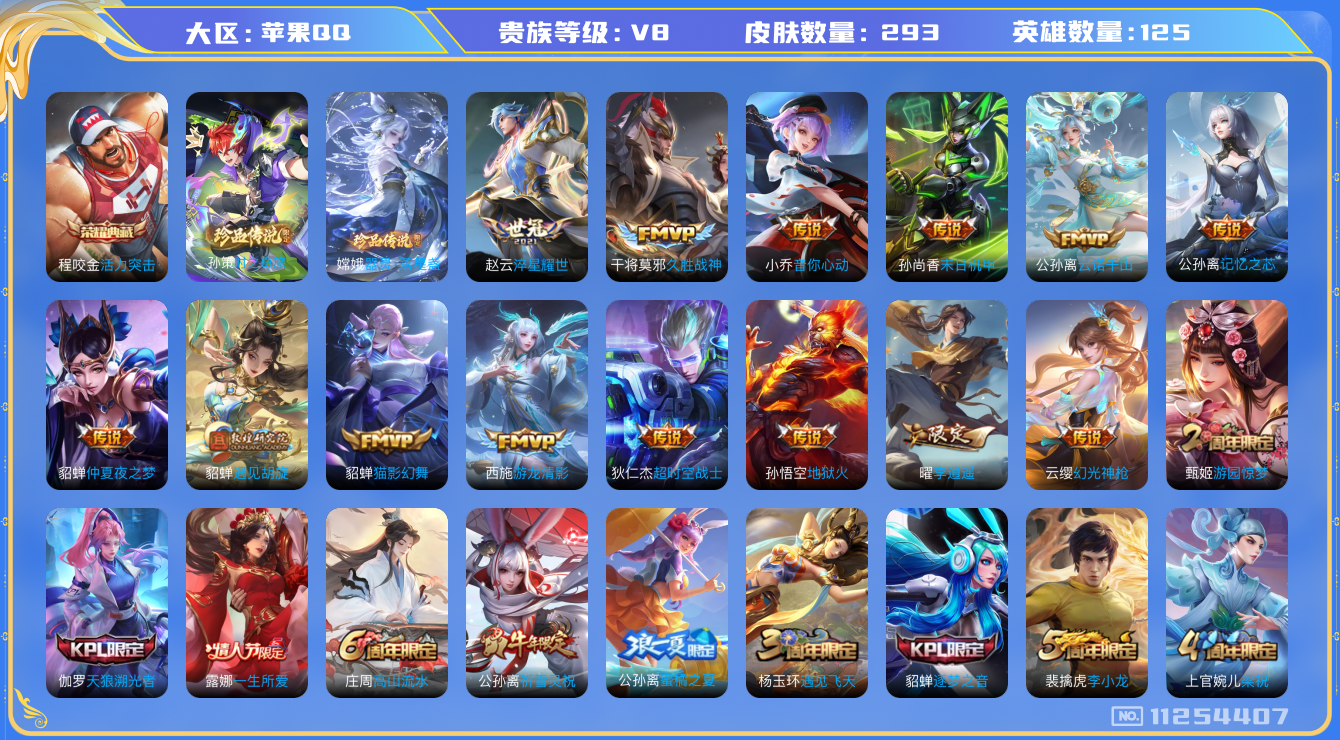 - [11679735]V8 1典藏 20传说 124英雄 283皮肤 可修改实名 女号 优质装备:鸣剑·曳影,黄金狮子座,久胜战神,炽阳神光,一念神魔,零号·赤焰,地狱之眼,时之恋人-刘备(电焊工),山海·苍雷引(电光曜子) 传说皮:貂蝉曦玄引,吕布曦玄引,典韦战鼓燎原,云诺千山,幻光神枪 珍宝阁皮:万物之道,优雅恋人,女武神 限定皮:愿照·九州拓(澜年限),愿照·千秋盛(女娲年限),鸣野蒿,至尊宝,白虎志(电光耗子),异界灵契(白毛香),神威(电光马子),飞衡(韩信年限),高山流水,五谷丰年,游园惊梦,梁祝,逐梦之星,李小龙,逐梦之影,朱雀志(守约年限),霸王别姬-项羽,孙行者,猪悟能,一生所爱,引擎之心,青春决赛季,冰霜恋舞曲,匿光追影者,寅虎·御盾(廉颇年限),寅虎·瑞焰(虎皮蛋子) 史诗皮:鸭鸭历险记-刘禅,器灵·浮梦炉,化蝶舞,星界战将,石田雨龙,茶境仙,埋骨钱,乘龙·聚宝船(安琪拉年限),百相守梦-黄忠,紫霞仙子,黄金分割率,特工魅影,千年之狐,江河有灵,高渐离燃音魔法,蒙恬荣光圣徽,偶像歌手,晚萤,青蛇,猫狗日记-孙策,猫狗日记-大乔,乱世虎臣,节奏热浪,修罗,女仆咖啡,摇滚巨星,水果甜心,绅士熊喵,天才门将,星夜王子,心灵骇客,时之奇旅-安琪拉,功夫厨神,德古拉伯爵,暗隐猎兽者,幽灵船长,鬼剑武藏,心灵战警,乐园奇幻夜,舞动绿茵,地狱岩魂,纤云弄巧,繁星吟游(呼啦呼啦),缤纷独角兽,乘风破浪,逐浪之夏,月团寄思,水晶猎龙者,曙光守护者,箭羽风息,金属风暴,原初追逐者,圣诞狂欢,圣诞恋歌,鹰眼统帅,魅力维加斯,黎明之约,寅虎·御盾,无心,未来纪元-赵云