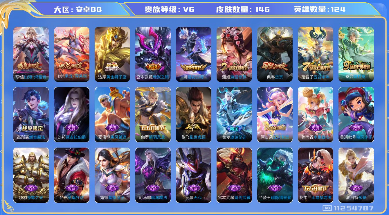 - [11471732]V7 1典藏 10传说 124英雄 222皮肤 可修改实名 优质装备:弑枪猎影(韩信典藏),久胜战神,一念神魔,云霓雀翎,地狱火,仲夏夜之梦(大飞蛾),零号·赤焰,无双飞将 传说皮:九山相柳 珍宝阁皮:玩趣恶龙 限定皮:逐霄战戟,陌上桑,鸣野蒿,时雨天司(水龙头),龙胆,天狼绘梦者,李小龙,孙行者 史诗皮:鸭鸭历险记-刘禅,龙之律动,石田雨龙,百相守梦-周瑜,破空之剑,战舞者,谪仙醉月,蔬乡物语(鲁班七号),百相守梦-百里守约,炽弈燎原,百相守梦-黄忠,紫霞仙子,黄金分割率,千年之狐,真我赫兹(百里守约),偶像歌手,无限星赏官,晚萤,末日机甲-吕布,猫狗日记-孙策,时之恋人-孙尚香,乱世虎臣,节奏热浪,修罗,女仆咖啡,水果甜心,绅士熊喵,心灵骇客,功夫厨神,暗隐猎兽者,幽灵船长,鬼剑武藏,乐园奇幻夜,天秀·启明,舞动绿茵,纤云弄巧,繁星吟游(呼啦呼啦),缤纷独角兽,逐浪之夏,月团寄思,水晶猎龙者,曙光守护者,热力回旋,箭羽风息,金属风暴,圣诞狂欢,鹰眼统帅,王者之锤,无心