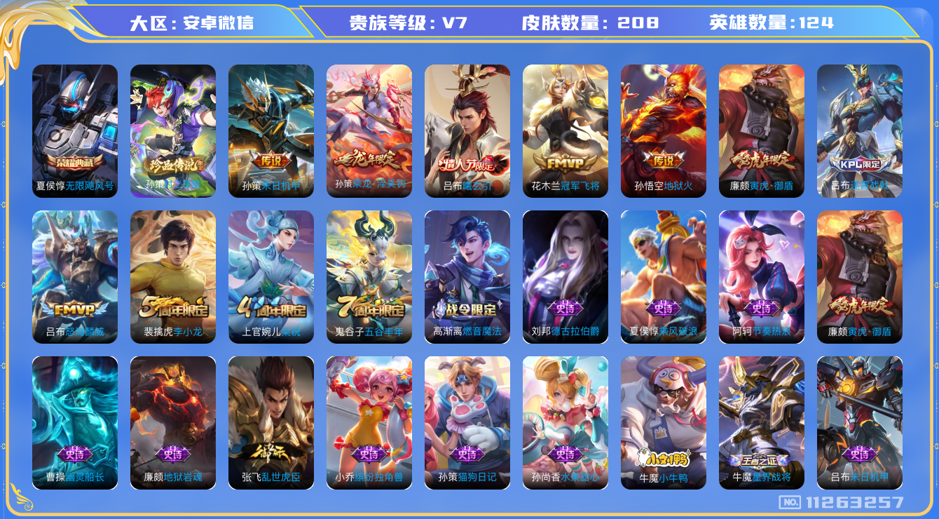 [11263257]V7 1典藏 1珍品传说 6传说 124英雄 208皮肤 可修改实名 优质装备:无限飓风号(高达),冠军飞将,地狱火,末日机甲-孙策 珍品传说:时之奇旅-孙策 传说皮:乘龙·淬吴钩(孙策年限),吕布曦玄引 珍宝阁皮:玩趣恶龙 限定皮:逐霄战戟,怒海麟威,五谷丰年,梁祝,李小龙,寅虎·御盾(廉颇年限) 史诗皮:赞萌露比,鸭鸭历险记-刘禅,星界战将,龙之律动,小牛鸭,百相守梦-周瑜,百相守梦-百里守约,特工魅影,高渐离燃音魔法,蒙恬荣光圣徽,晚萤,末日机甲-吕布,猫狗日记-孙策,乱世虎臣,节奏热浪,摇滚巨星,水果甜心,天才门将,星夜王子,功夫厨神,德古拉伯爵,暗隐猎兽者,幽灵船长,鬼剑武藏,乐园奇幻夜,地狱岩魂,纤云弄巧,拒霜思,缤纷独角兽,乘风破浪,逐浪之夏,水晶猎龙者,金属风暴,原初追逐者,鹰眼统帅,魅力维加斯,黎明之约,寅虎·御盾,未来纪元-赵云