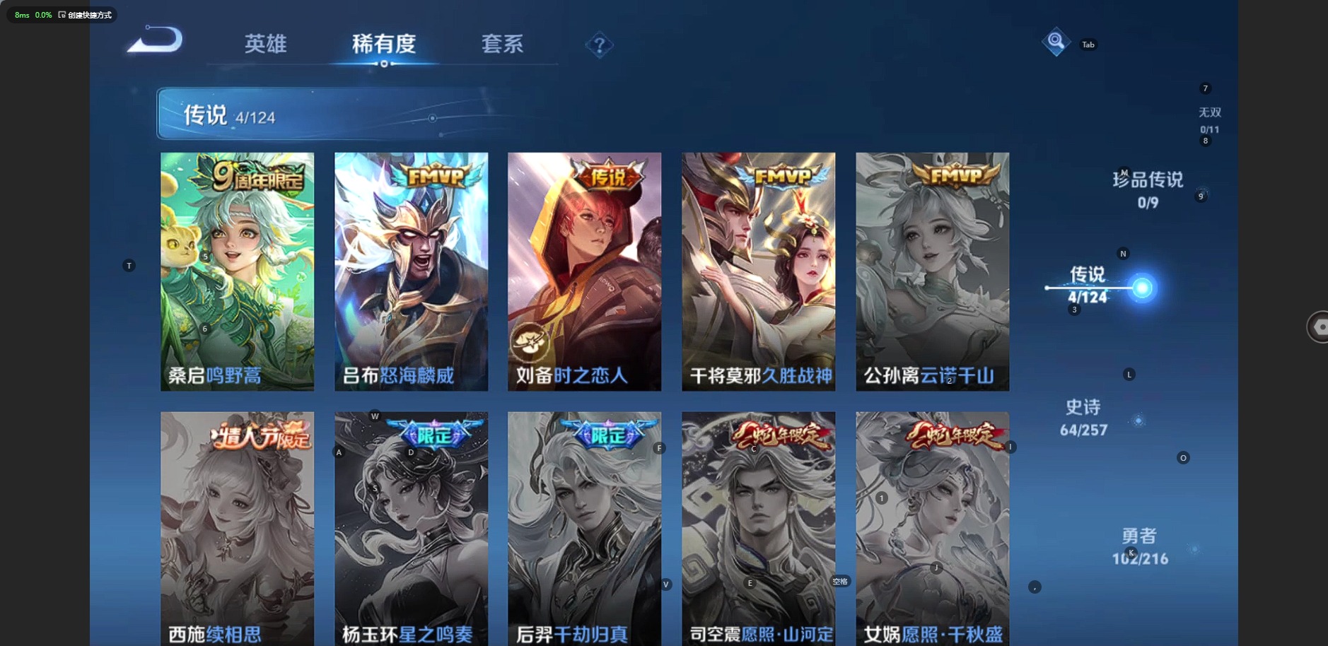 - [11472274]V6 1典藏 2传说 124英雄 214皮肤 可修改实名 荣耀水晶:幻阙歌(貂蝉典藏) 传说皮:炽阳神光 珍宝阁皮:妄想食味,优雅恋人,蔷薇恋人,女武神 限定皮:鸣野蒿,山海·碧波行(瑶年限),遇见飞天,高山流水,五谷丰年,游园惊梦,梁祝,李小龙 史诗皮:星界战将,蒙犽顽岩魄,紫霞仙子,苍穹之光,永昼,江河有灵,蒙恬荣光圣徽,冰冠公主,偶像歌手,晚萤,魅语,电玩·爆裂旋风,暗夜猫娘,末日机甲-吕布,猫狗日记-孙策,猫狗日记-大乔,时之恋人-孙尚香,乱世虎臣,节奏热浪,女仆咖啡,摇滚巨星,水果甜心,绅士熊喵,天才门将,功夫厨神,德古拉伯爵,暗隐猎兽者,幽灵船长,鬼剑武藏,纤云弄巧,繁星吟游(呼啦呼啦),缤纷独角兽,乘风破浪,逐浪之夏,热力回旋,箭羽风息,金属风暴,原初追逐者,圣诞狂欢,圣诞恋歌,鹰眼统帅,魅力维加斯,黎明之约,千筹问战,未来纪元-赵云