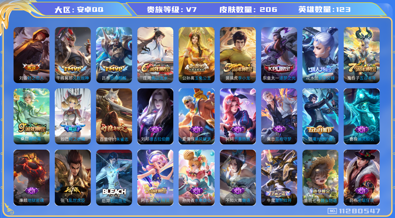 [11280547]V7 4传说 123英雄 206皮肤 可修改实名 传说皮:久胜战神,时之恋人-刘备(电焊工) 珍宝阁皮:蔷薇恋人,女武神,玩趣恶龙 限定皮:鸣野蒿,时之彼端,高山流水,怒海麟威,五谷丰年,李小龙,逐梦之光,朱雀志(守约年限),默契交锋-花木兰,玉兔公主 史诗皮:星界战将,石田雨龙,百相守梦-黄忠,蔬乡物语(鲁班七号),紫霞仙子,黄金分割率,特工魅影,千年之狐,江河有灵,蒙恬荣光圣徽,冰冠公主,无限星赏官,魅语,末日机甲-吕布,乱世虎臣,节奏热浪,修罗,女仆咖啡,水果甜心,天才门将,星夜王子,心灵骇客,时之奇旅-安琪拉,功夫厨神,德古拉伯爵,暗隐猎兽者,幽灵船长,鬼剑武藏,心灵战警,地狱岩魂,纤云弄巧,乘风破浪,逐浪之夏,水晶猎龙者,曙光守护者,热力回旋,金属风暴,原初追逐者,圣诞狂欢,圣诞恋歌,鹰眼统帅,暗夜贵公子,魅力维加斯,黎明之约,无心,未来纪元-赵云