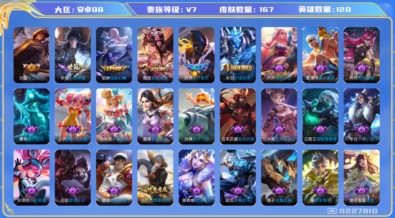 - [12087112]V7 1典藏 8传说 124英雄 261皮肤 可修改实名 优质装备:九霄神辉(木兰典藏),久胜战神,地狱火,地狱之眼,无双飞将 传说皮:乘龙·铭钟鼎(赵云年限) 珍宝阁皮:蔷薇恋人,玩趣恶龙 限定皮:逐霄战戟,鸣野蒿,至尊宝,凤求凰(白切鸡),飞衡(韩信年限),遇见飞天,齐天大圣,青龙志(铠年限),李小龙,大圣娶亲,美猴王 史诗皮:鸭鸭历险记-刘禅,龙之律动,琥珀纪元伽罗,乘龙·聚宝船(安琪拉年限),百相守梦-百里守约,百相守梦-黄忠,紫霞仙子,苍穹之光,电玩小子(小书包),白龙吟,特工魅影,千年之狐,魅语,无限星赏官,暗夜猫娘,末日机甲-吕布,乱世虎臣,节奏热浪,修罗,女仆咖啡,摇滚巨星,水果甜心,天才门将,星夜王子,心灵骇客,功夫厨神,德古拉伯爵,暗隐猎兽者,幽灵船长,鬼剑武藏,暗渊魔法,心灵战警,舞动绿茵,纤云弄巧,乘风破浪,逐浪之夏,水晶猎龙者,曙光守护者,箭羽风息,金属风暴,原初追逐者,圣诞狂欢,鹰眼统帅,暗夜贵公子,魅力维加斯