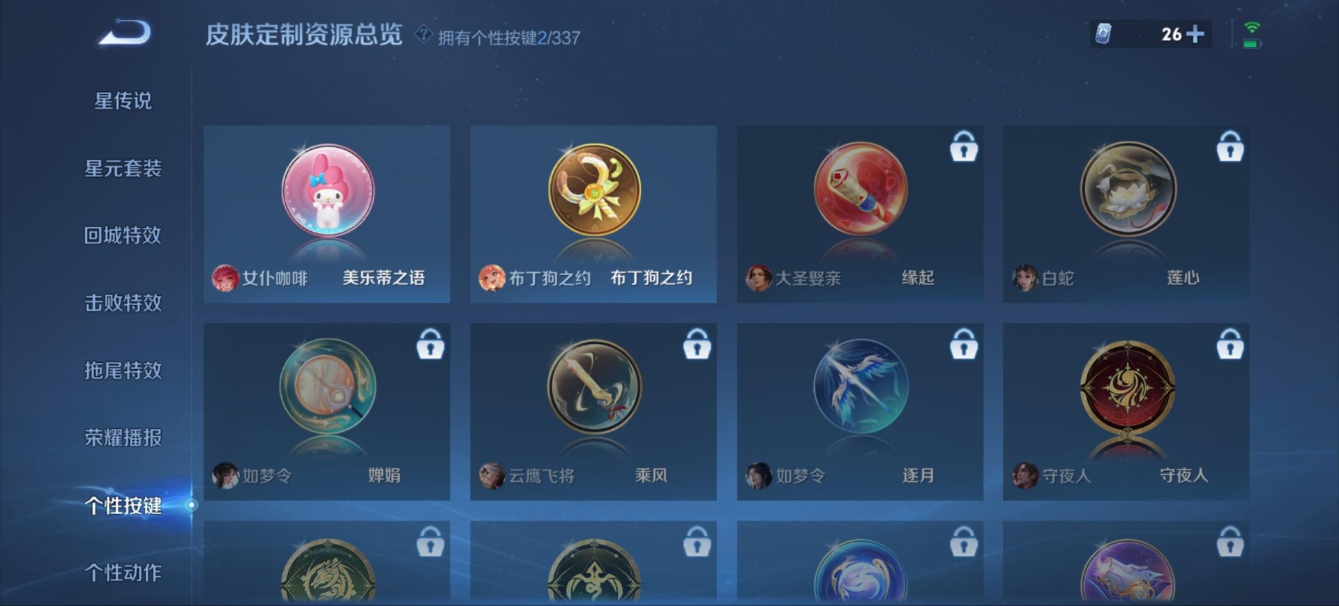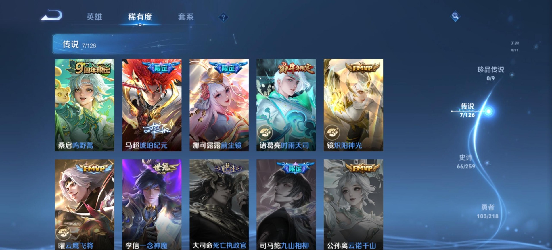 干将莫邪冰霜恋舞曲,吕布御风骁将,后羿如梦令,露娜一生所爱,诸葛亮时雨天司,杨玉环寅虎·心曲,裴擒虎李小龙,上官婉儿梁祝,花木兰默契交锋,桑启鸣野蒿,芈月白晶晶,孙悟空至尊宝,马超神威,韩信傲雪梅枪,百里守约朱雀志,娜可露露前尘镜,关羽冰锋战神