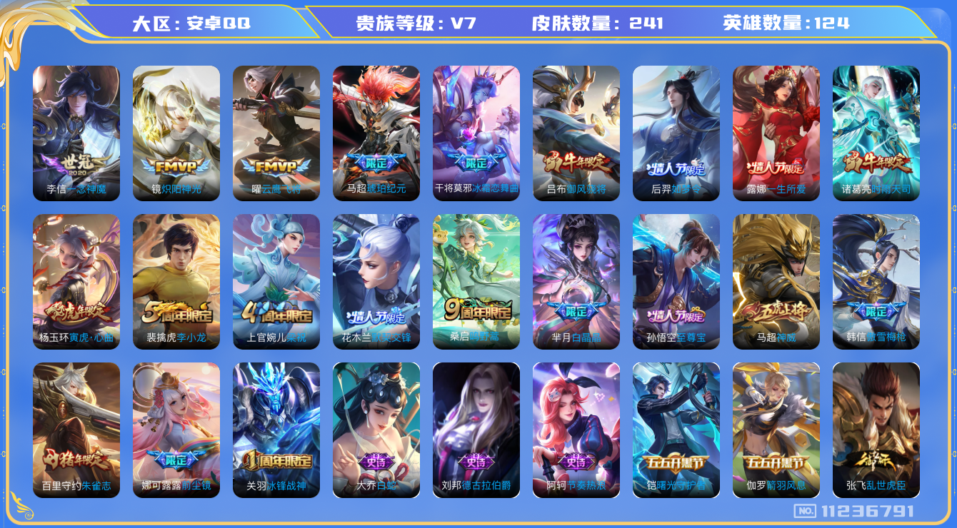 - [12204045]V7 1典藏 1珍品传说 9传说 125英雄 203皮肤 可修改实名 优质装备:鸣剑·曳影,怪盗基德,炽阳神光,山海·炽霜斩(李信年限) 传说皮:祥瑞亨通,幻光神枪 珍宝阁皮:万物之道,蔷薇恋人 限定皮:愿照·九州拓(澜年限),愿照·岁时盈(虞姬年限),愿照·山河定(司空震年限),鸣野蒿,遇见飞天,诗剑行,五谷丰年,李小龙,山海·玄木吟(马可年限) 史诗皮:星界战将,龙之律动,茶境仙,怒海争锋,破空之剑,蒙犽顽岩魄,百相守梦-百里守约,紫霞仙子,苍穹之光,电玩小子(小书包),黄金分割率,特工魅影,江河有灵,真我赫兹(镜),魅语,百解令(蒙犽),蒙恬荣光圣徽,偶像歌手,白蛇,电玩·爆裂旋风,末日机甲-吕布,乱世虎臣,节奏热浪,摇滚巨星,水果甜心,星夜王子,心灵骇客,功夫厨神,暗隐猎兽者,幽灵船长,鬼剑武藏,天秀·启明,缤纷独角兽,乘风破浪,逐浪之夏,月团寄思,水晶猎龙者,曙光守护者,箭羽风息,唤灵魅影,金属风暴,原初追逐者,圣诞狂欢,圣诞恋歌,鹰眼统帅,黎明之约,赏金猎手,无心,未来纪元-赵云
