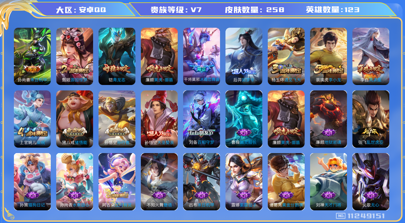 [11249151]V7 2传说 123英雄 258皮肤 典藏英雄武则天 可修改实名 传说皮:末日机甲-孙尚香(绿蚂蚱) 珍宝阁皮:优雅恋人,蔷薇恋人,女武神 限定皮:凤求凰(白切鸡),遇见飞天,青龙志(铠年限),游园惊梦,梁祝,李小龙,如梦令-后羿,孙行者,猪悟能,大圣娶亲,冰霜恋舞曲,寅虎·御盾(廉颇年限) 史诗皮:紫霞仙子,黄金分割率,千年之狐,永昼,江河有灵,冰冠公主,偶像歌手,晚萤,无限星赏官,魅语,百相守梦(刘备),末日机甲-吕布,猫狗日记-孙策,乱世虎臣,摇滚巨星,水果甜心,天才门将,星夜王子,心灵骇客,时之奇旅-安琪拉,功夫厨神,暗隐猎兽者,幽灵船长,鬼剑武藏,舞动绿茵,地狱岩魂,纤云弄巧,繁星吟游(呼啦呼啦),拒霜思,逐浪之夏,水晶猎龙者,金属风暴,原初追逐者,圣诞恋歌,鹰眼统帅,魅力维加斯,奇遇舞章,寅虎·御盾,无心,未来纪元-赵云