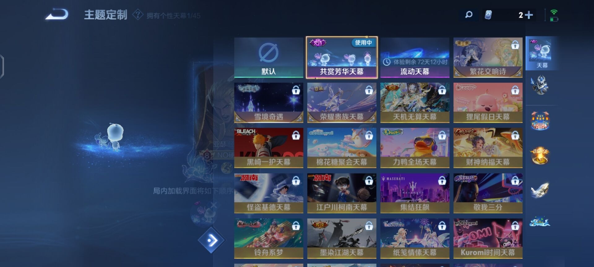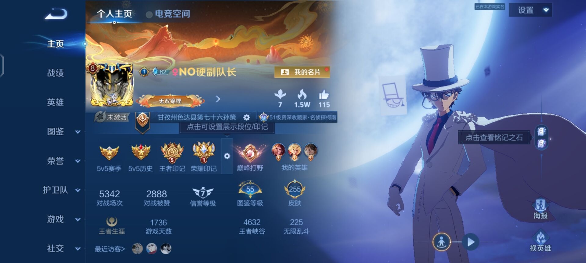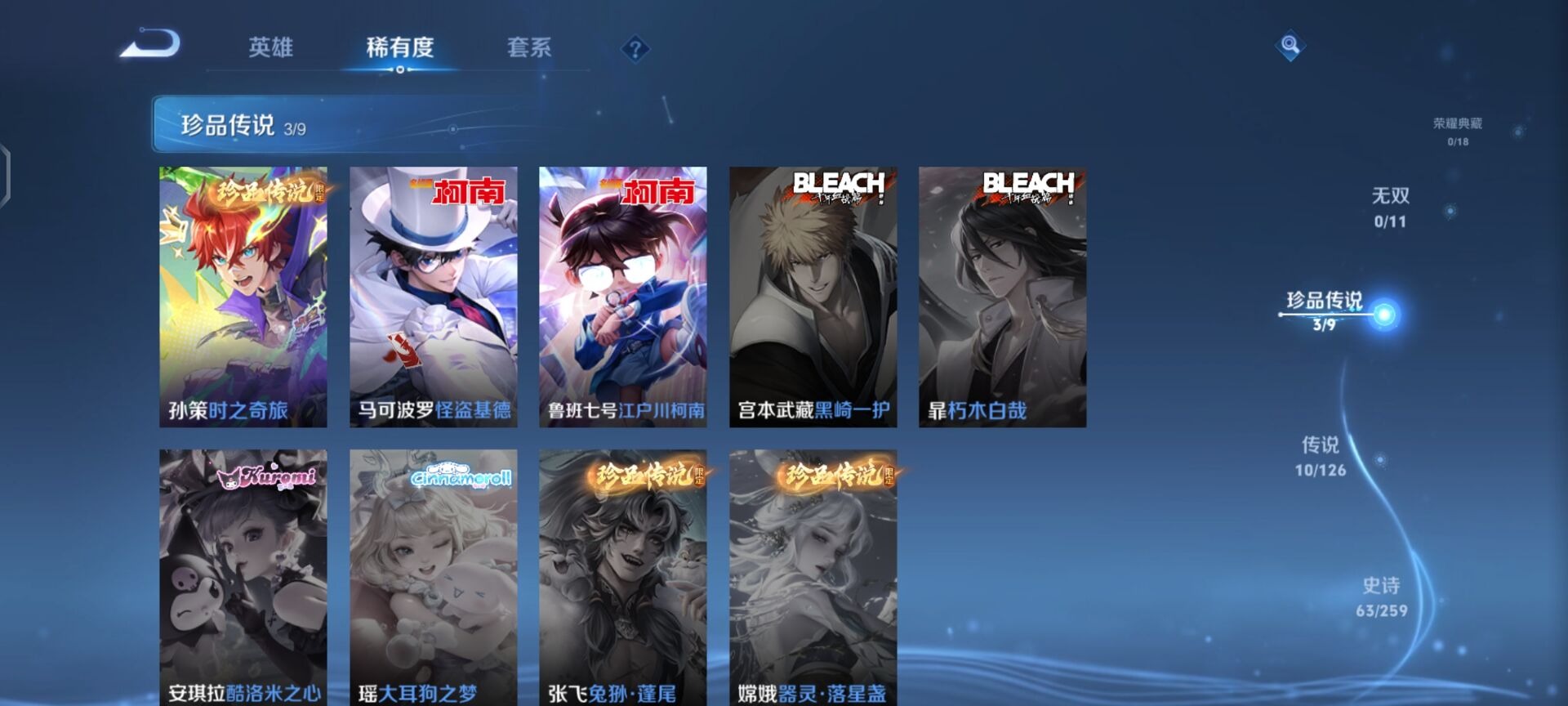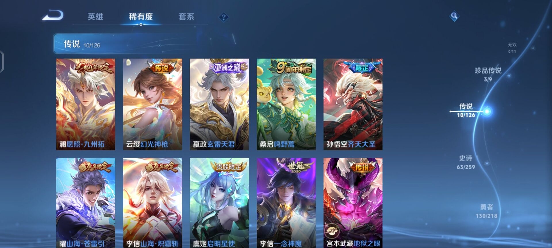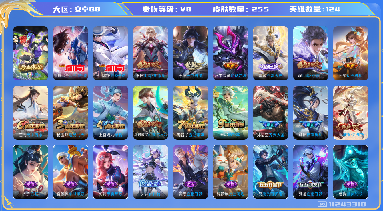- PX_2095156-实名: 可修改 贵族等级: V7 英雄数: 125 皮肤数: 207 珍品传说: 时之奇旅-孙策 星传说: 未来机甲 传说皮: 一念神魔,末日机甲-孙尚香,李逍遥,乞巧织情,无双飞将,澜逐花归海,乘龙·铭钟鼎,幻光神枪 限定皮: 李小龙,游园惊梦,白虎志,朱雀志,武陵仙君,高山流水,孙行者,傲雪梅枪,玉兔公主,启示之音,逐霄战戟,愿照·岁时盈,愿照·九州拓