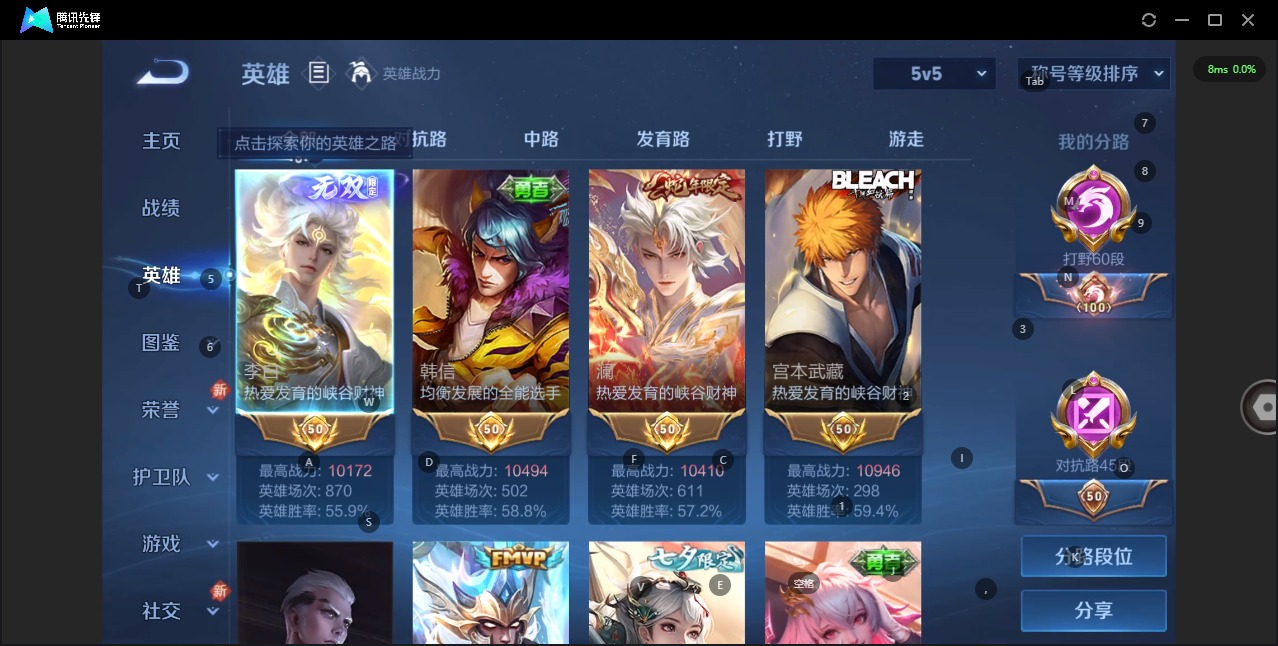 [11252021]V8 1典藏 1无双 3珍品传说 21传说 123英雄 264皮肤 可修改实名 荣耀水晶:鸣剑·曳影 无双皮:碎月剑心(李白无双) 珍品传说:怪盗基德,朽木白哉,黑崎一护 传说皮:琥珀纪元马超,落雪白狼,幻光神枪,祥瑞亨通,地狱之眼,末日机甲-孙尚香(绿蚂蚱),一念神魔,淬星耀世,云鹰飞将(小将军),无双飞将,电玩·雷克斯,妄想实况,鹤归松栖(云缨),澜逐花归海 珍宝阁皮:蔷薇恋人,女武神 限定皮:愿照·九州拓(澜年限),逐霄战戟,鸣野蒿,神威(电光马子),高山流水,怒海麟威,五谷丰年,武圣,祈雪灵祝(雪兔子),李小龙,寅虎·赤拳(老虎年限) 史诗皮:星界战将,谪仙醉月,鸭鸭历险记-刘禅,龙之律动,石田雨龙,百相守梦-百里守约,蔬乡物语(鲁班七号),超元猎域,琥珀纪元伽罗,百相守梦-周瑜,化蝶舞,破空之剑,紫霞仙子,特工魅影,千年之狐,鹤归松栖(赵怀真),江河有灵,高渐离燃音魔法,雪夜绮愿(周瑜),百解令(蒙犽),蒙恬荣光圣徽,冰冠公主,偶像歌手,晚萤,电玩·爆裂旋风,末日机甲-吕布,猫狗日记-大乔,节奏热浪,女仆咖啡,摇滚巨星,水果甜心,绅士熊喵,天才门将,星夜王子,心灵骇客,德古拉伯爵,暗隐猎兽者,幽灵船长,鬼剑武藏,心灵战警,乐园奇幻夜,舞动绿茵,地狱岩魂,拒霜思,缤纷独角兽,乘风破浪,逐浪之夏,月团寄思,水晶猎龙者,曙光守护者,金属风暴,原初追逐者,圣诞狂欢,圣诞恋歌,鹰眼统帅,魅力维加斯,黎明之约,赏金猎手,无心