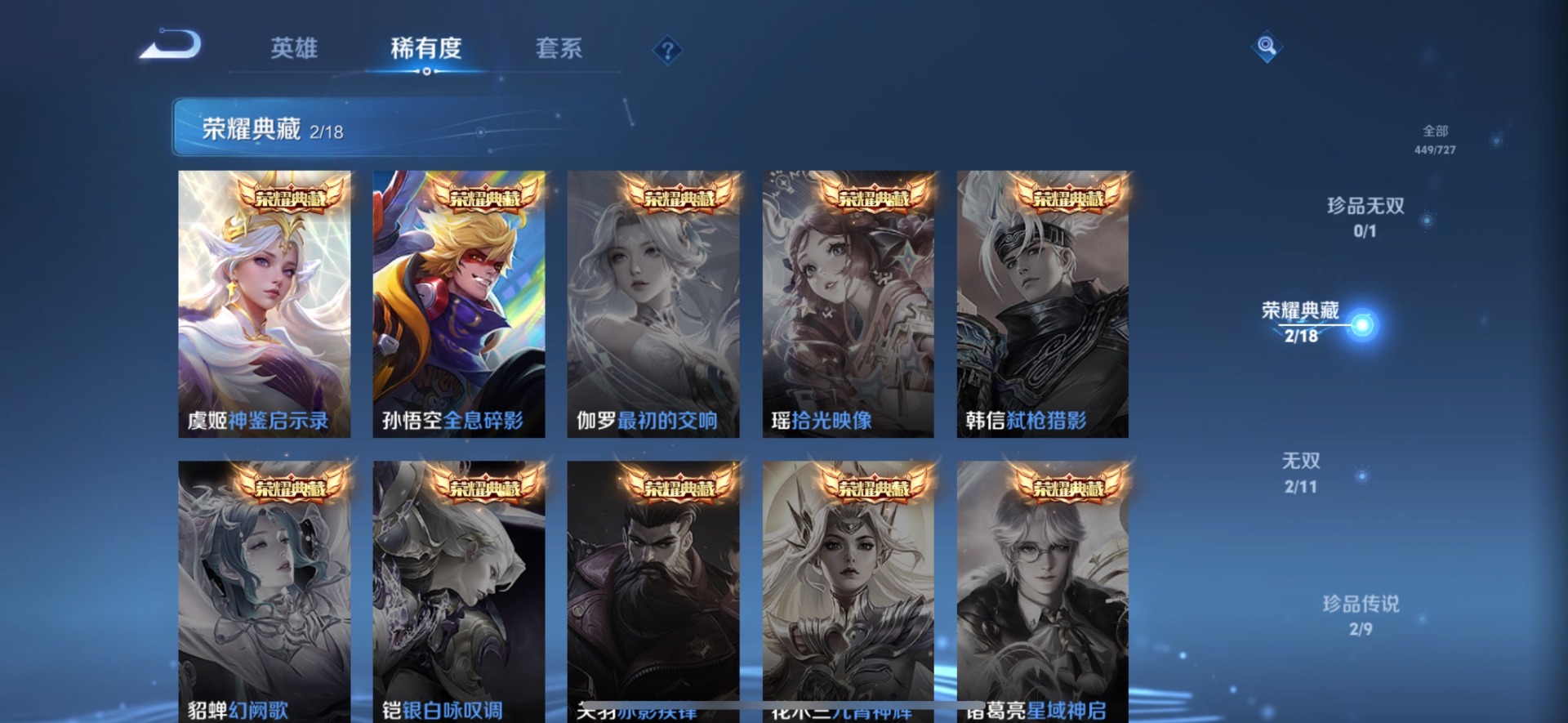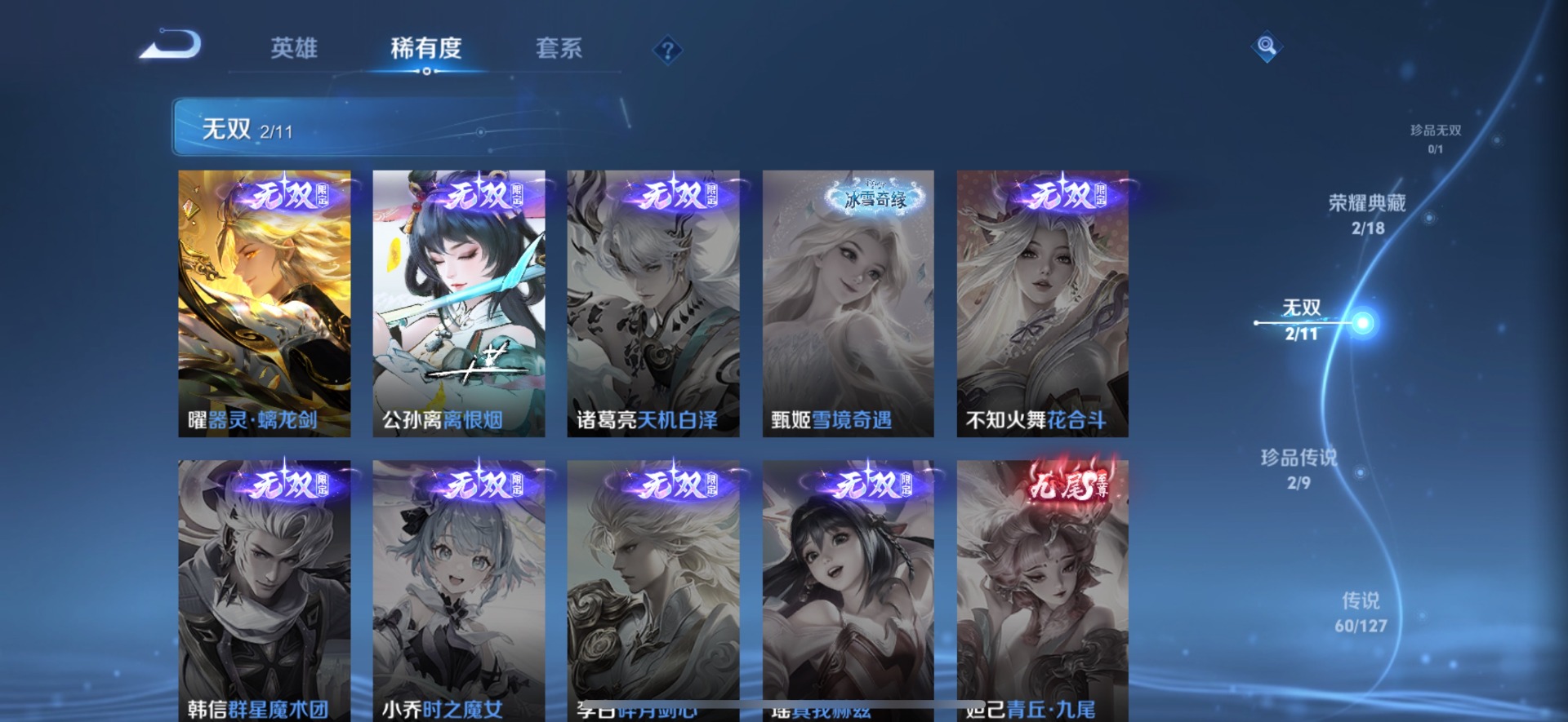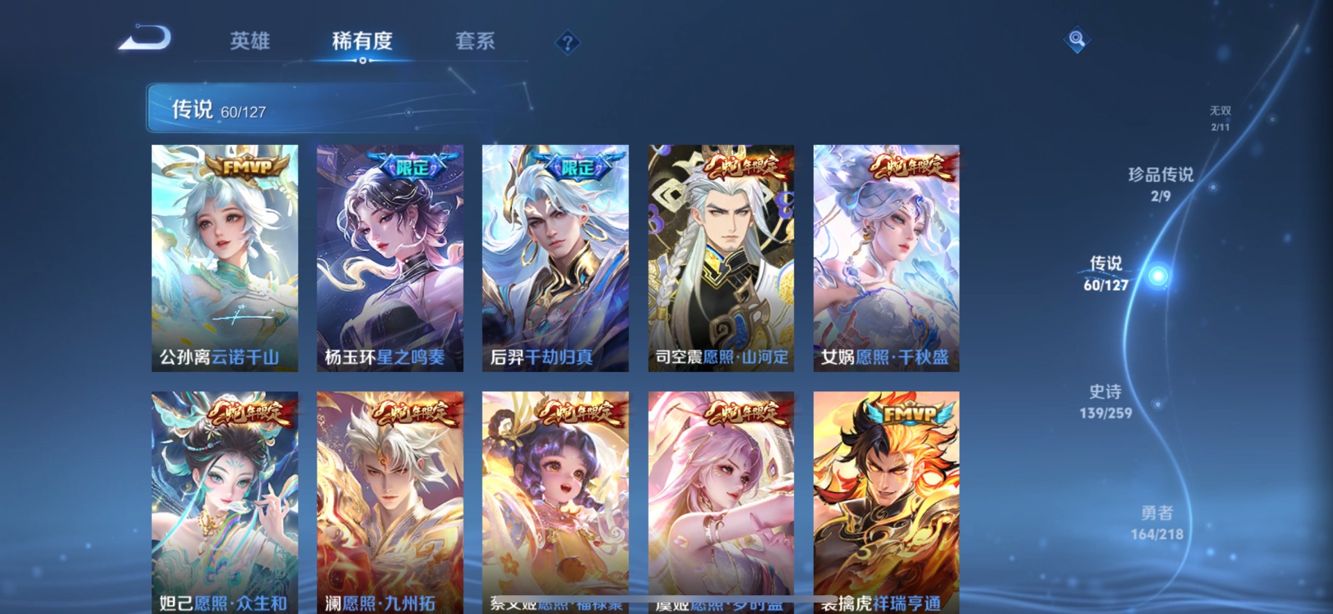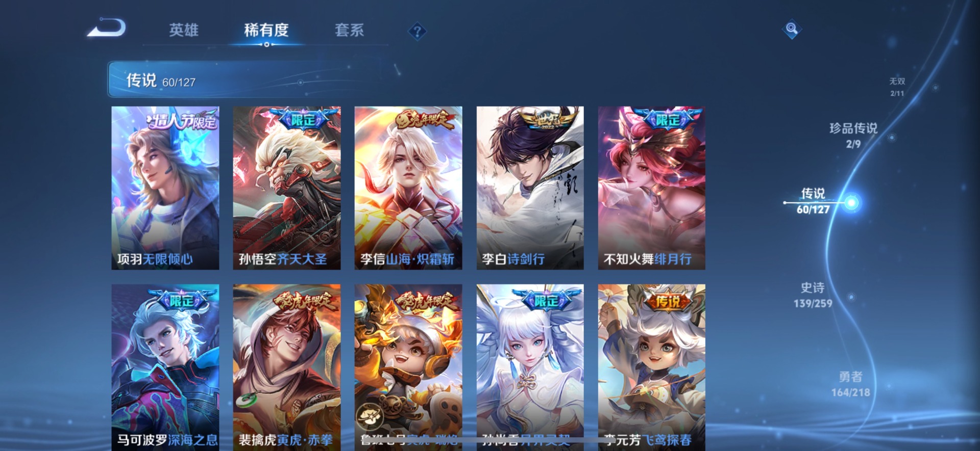- PX_2111818-Q/至圣王者/257皮肤/124英雄/1典藏/1珍品无双/4无双/4珍品传说/16传说/72史诗/8稀有英雄 【1 珍品无双】馥梦繁花, 【4 珍品传说】酷洛米之心 安琪拉,朽木白哉 暃,黑崎一护 宫本武藏,怪盗基德 马可波罗, 【1 典藏皮肤】幻阙歌 貂蝉, 【4 无双皮肤】天机白泽 诸葛亮,时之魔女 小乔,青丘·九尾 妲己,花合斗 不知火舞, 【16 传说皮肤】启明星使