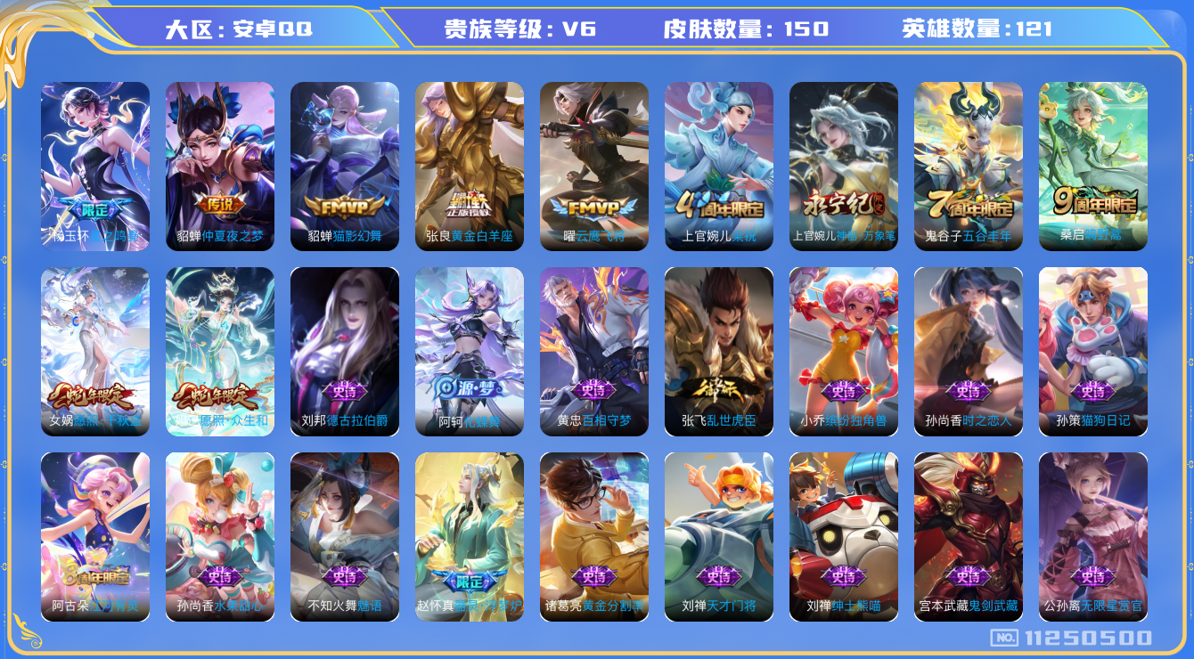 [11250500]V6 8传说 121英雄 150皮肤 可修改实名 传说皮:星之鸣奏,黄金白羊座,仲夏夜之梦(大飞蛾),猫影幻舞,云鹰飞将(小将军) 珍宝阁皮:胡桃夹子,蔷薇恋人 限定皮:愿照·众生和(妲己年限),愿照·千秋盛(女娲年限),鸣野蒿,五谷丰年,梁祝,神器·万象笔 史诗皮:器灵·浮梦炉,百相守梦-黄忠,化蝶舞,遇见神鹿,黄金分割率,特工魅影,江河有灵,无限星赏官,魅语,猫狗日记-孙策,时之恋人-孙尚香,乱世虎臣,摇滚巨星,水果甜心,绅士熊喵,天才门将,心灵骇客,功夫厨神,德古拉伯爵,鬼剑武藏,缤纷独角兽,水晶猎龙者,金属风暴,圣诞恋歌,鹰眼统帅,魅力维加斯