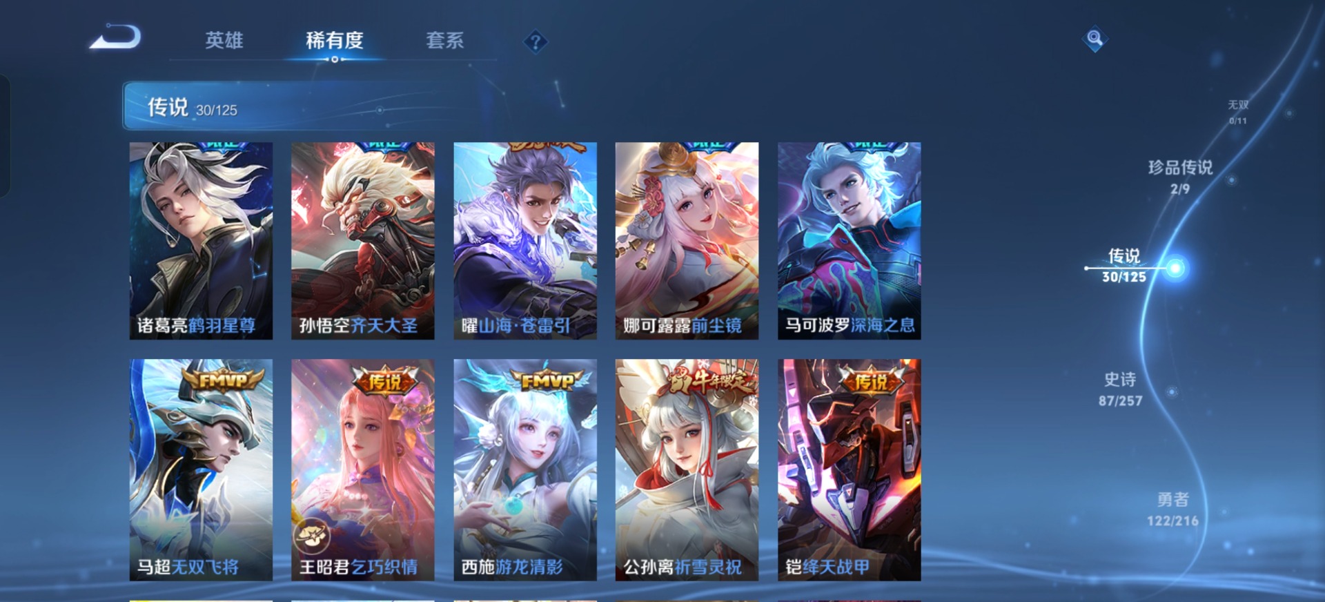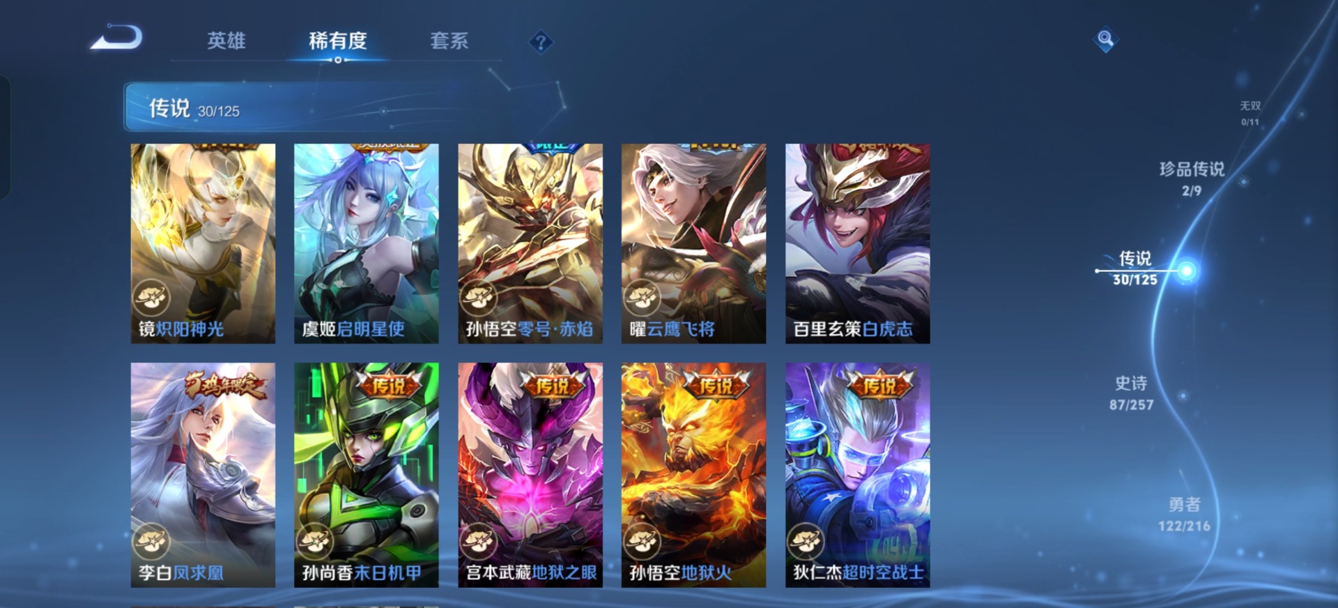 - PX_2099902-Q/永恒钻石/231皮肤/125英雄/1典藏/0珍品无双/0无双/0珍品传说/10传说/65史诗/9稀有英雄 【1 典藏皮肤】拾光映像 瑶, 【10 传说皮肤】零号·赤焰 孙悟空,时雨天司 诸葛亮,黄金射手座 后羿,挚爱之约 孙策,寅虎·赤拳 裴擒虎,超时空战士 狄仁杰,愿照·九州拓 澜,愿照·山河定 司空震,愿照·千秋盛 女娲,鸣野蒿 桑启, 【65 史诗皮肤】电玩小子 鲁