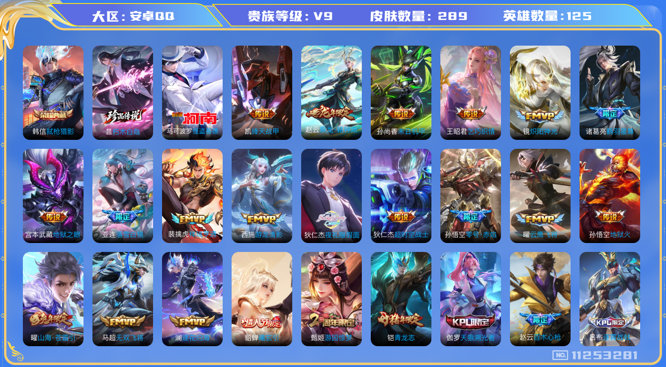 [11253281]V9 1典藏 2珍品传说 30传说 125英雄 289皮肤 可修改实名 荣耀水晶:弑枪猎影(韩信典藏) 珍品传说:怪盗基德,朽木白哉 传说皮:乘龙·铭钟鼎(赵云年限),貂蝉曦玄引,落雪白狼,祥瑞亨通,游龙清影(小青龙),零号·赤焰,地狱火,地狱之眼,末日机甲-孙尚香(绿蚂蚱),云鹰飞将(小将军),炽阳神光,无双飞将,乞巧织情,绛天战甲(鸡嘴战神),超时空战士-狄仁杰,山海·苍雷引(电光曜子),鹤羽星尊,夜礼服假面,澜逐花归海 珍宝阁皮:妄想食味,玩趣恶龙 限定皮:愿照·九州拓(澜年限),愿照·岁时盈(虞姬年限),逐霄战戟,陌上桑,鸣野蒿,至尊宝,白虎志(电光耗子),凤求凰(白切鸡),傲雪梅枪,前尘镜,影龙天霄,齐天大圣,五谷丰年,青龙志(铠年限),游园惊梦,天狼狩猎者,逐梦之星,天狼溯光者,祈雪灵祝(雪兔子),逐梦之影,逐梦之光,如梦令-后羿,孙行者,引擎之心,时之祈愿-云中君,百木心枪,深海之息(深海大菠萝),山海·玄木吟(马可年限) 史诗皮:星界战将,雪豹·霜爪,百相守梦-百里守约,东方月初,蒙犽顽岩魄,埋骨钱,星界特工,炽弈燎原,化蝶舞,破空之剑,紫霞仙子,苍穹之光,电玩小子(小书包),黄金分割率,特工魅影,千年之狐,真我赫兹(百里守约),鹤归松栖(赵怀真),末日机甲-莱西奥,匿光侦查者,江河有灵,蒙恬荣光圣徽,冰冠公主,青蛇,偶像歌手,晚萤,无限星赏官,魅语,电玩·爆裂旋风,暗夜猫娘,龙骑士(小龙虾),末日机甲-吕布,猫狗日记-孙策,乱世虎臣,节奏热浪,修罗,水果甜心,绅士熊喵,天才门将,星夜王子,心灵骇客,功夫厨神,德古拉伯爵,暗隐猎兽者,幽灵船长,鬼剑武藏,暗渊魔法,地狱岩魂,缤纷独角兽,乘风破浪,逐浪之夏,水晶猎龙者,曙光守护者,金属风暴,原初追逐者,圣诞狂欢,鹰眼统帅,暗夜贵公子,魅力维加斯,黎明之约,赏金猎手,滕王阁序,未来纪元-赵云