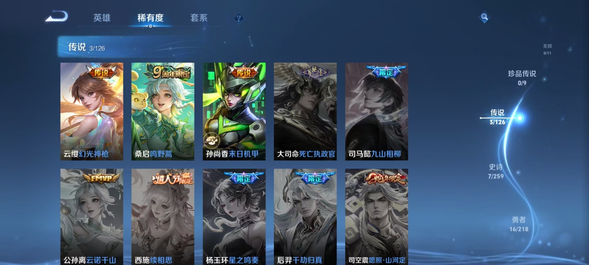- [11852823]V9 4典藏 25传说 126英雄 366皮肤 典藏英雄武则天 可修改实名 优质装备:鸣剑·曳影,全息碎影(猴子典藏),九霄神辉(木兰典藏),弑枪猎影(韩信典藏),冠军飞将,云鹰飞将(小将军),久胜战神,一念神魔,地狱火,仲夏夜之梦(大飞蛾),海洋之心,音你心动-周瑜,淬星耀世,超时空战士-狄仁杰,音你闪耀(rap皮),碎云,山海·炽霜斩(李信年限),山海·苍雷引(电光曜子),画中仙,鹤归松栖(云缨) 珍宝阁皮:优雅恋人,蔷薇恋人,女武神 限定皮:鸣野蒿,至尊宝,凤求凰(白切鸡),太华(伽罗年限),武陵仙君(小桃花),时雨天司(水龙头),高山流水,诗剑行,怒海麟威,五谷丰年,青龙志(铠年限),梁祝,天狼溯光者,李小龙,朱雀志(守约年限),如梦令-后羿,孙行者,猪悟能,大圣娶亲,寅虎·御盾(廉颇年限),深海之息(深海大菠萝),冰霜神祇 史诗皮:鸭鸭历险记-刘禅,化蝶舞,灵蛊蚀心,星界战将,怒海争锋,百相守梦-黄忠,遇见神鹿,紫霞仙子,苍穹之光,电玩小子(小书包),白龙吟,黄金分割率,特工魅影,千年之狐,永昼,江河有灵,闲日渔趣,魅语,百解令(蒙犽),蒙恬荣光圣徽,冰冠公主,青蛇,偶像歌手,电玩·爆裂旋风,暗夜猫娘,龙骑士(小龙虾),末日机甲-吕布,猫狗日记-孙策,猫狗日记-大乔,时之恋人-孙尚香,乱世虎臣,节奏热浪,修罗,女仆咖啡,摇滚巨星,水果甜心,绅士熊喵,天才门将,星夜王子,心灵骇客,功夫厨神,德古拉伯爵,暗隐猎兽者,幽灵船长,鬼剑武藏,暗渊魔法,心灵战警,乐园奇幻夜,舞动绿茵,地狱岩魂,纤云弄巧,繁星吟游(呼啦呼啦),拒霜思,缤纷独角兽,乘风破浪,逐浪之夏,水晶猎龙者,曙光守护者,热力回旋,箭羽风息,金属风暴,原初追逐者,圣诞狂欢,圣诞恋歌,鹰眼统帅,暗夜贵公子,魅力维加斯,黎明之约,赏金猎手,寅虎·御盾,无心,未来纪元-赵云
