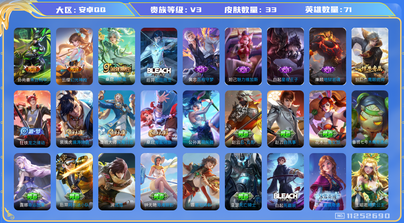 [11252690]V3 3传说 71英雄 33皮肤 可修改实名 优质装备:末日机甲-孙尚香(绿蚂蚱) 传说皮:幻光神枪 限定皮:鸣野蒿 史诗皮:龙之律动,石田雨龙,百相守梦-黄忠,星夜王子,地狱岩魂,鹰眼统帅,魅力维加斯