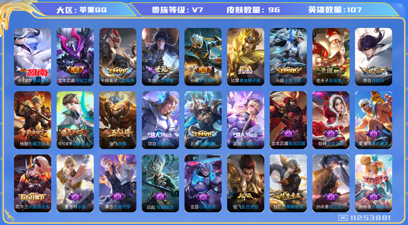 [11253881]V7 1珍品传说 11传说 107英雄 96皮肤 可修改实名 优质装备:怪盗基德,黄金狮子座,久胜战神,一念神魔,地狱之眼,末日机甲-孙策,无双飞将 限定皮:无限倾心-项羽,诗剑行,无限倾心-虞姬,怒海麟威,虎魄,永曜之星,圣诞老人,山海·玄木吟(马可年限) 史诗皮:苍鳞隐世,龙之律动,百相守梦-周瑜,百相守梦-黄忠,黄金分割率,特工魅影,永昼,冰冠公主,时之恋人-孙尚香,乱世虎臣,水果甜心,绅士熊喵,鬼剑武藏,心灵战警,乐园奇幻夜,乘风破浪,水晶猎龙者,金属风暴,原初追逐者,圣诞恋歌,鹰眼统帅,魅力维加斯,赏金猎手