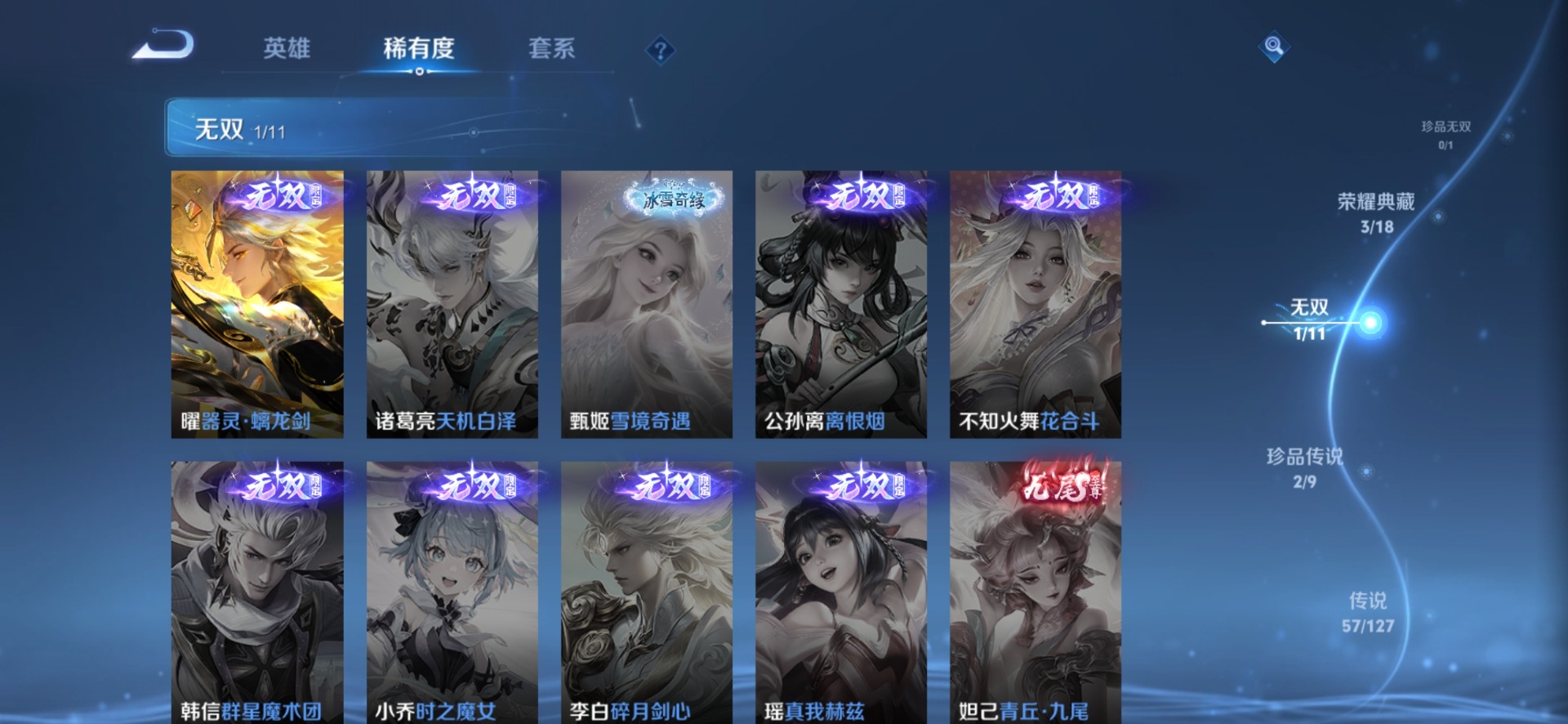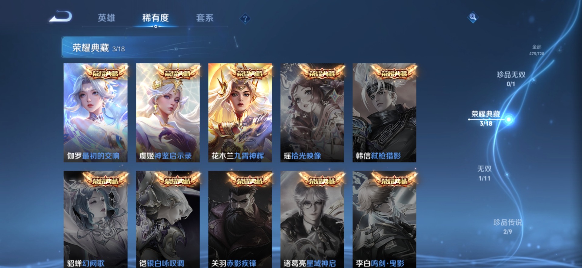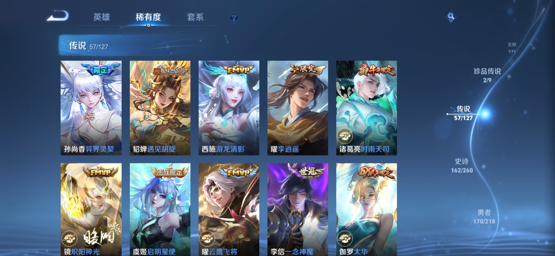 金蝉唐三藏,黄忠烈魂,哪吒逐梦之翼,盾山梦圆繁星,曹操天狼征服者,伽罗天狼溯光者,伽罗太华,苏烈玄武志,赵云百木心枪,赵云龙胆,孙膑天狼运算者,典韦岱宗,孙尚香异界灵契,不知火舞绯月行,鲁班七号寅虎·瑞焰,后羿无尽星芒,吕布御风骁将,后羿如梦令,露娜启示之音,镜匿光追影者,诸葛亮时雨天司,公孙离玉兔公主,公孙离蜜橘之夏,司空震愿照·山河定,裴擒虎李小龙,上官婉儿梁祝,上官婉儿神器·万象笔,上官婉儿天狼绘梦者,安琪拉魔法小厨娘,马可波罗山海·玄木吟,艾琳陌上桑,马可波罗深海之息,西施至美·乘鲤谣,桑启鸣野蒿,女娲补天,女娲愿照·千秋盛,孙悟空孙行者,马超神威,雅典娜神奇女侠,妲己时之彼端,妲己时之奇旅,妲己愿照·众生和,韩信傲雪梅枪,韩信飞衡,百里守约朱雀志,蔡文姬愿照·福禄聚,瑶山海·碧波行,澜愿照·九州拓,虞姬愿照·岁时盈,娜可露露前尘镜,王昭君凤凰于飞,王昭君星穹之声,橘右京枫霜尽