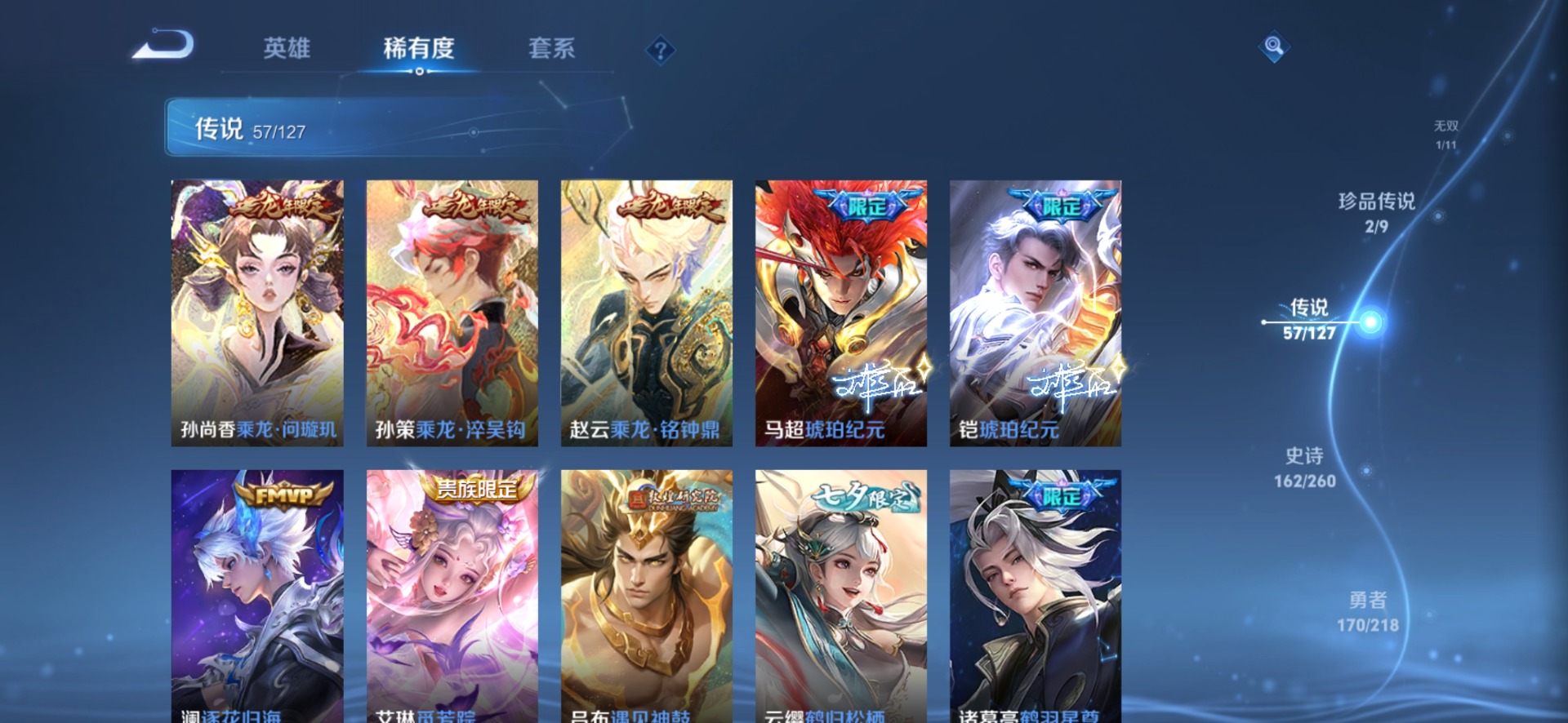 铠琥珀纪元,赵云乘龙·铭钟鼎,干将莫邪画中仙,李信一念神魔,孙策乘龙·淬吴钩,孙尚香乘龙·问璇玑,吕布遇见神鼓,镜炽阳神光,杨玉环星之鸣奏,貂蝉遇见胡旋,裴擒虎祥瑞亨通,夏洛特浮生妄,艾琳觅芳踪,西施游龙清影,狄仁杰神器·狴犴令,张良黄金白羊座,曜云鹰飞将,曜李逍遥,马超琥珀纪元,马超无双飞将,澜逐花归海,虞姬云霓雀翎