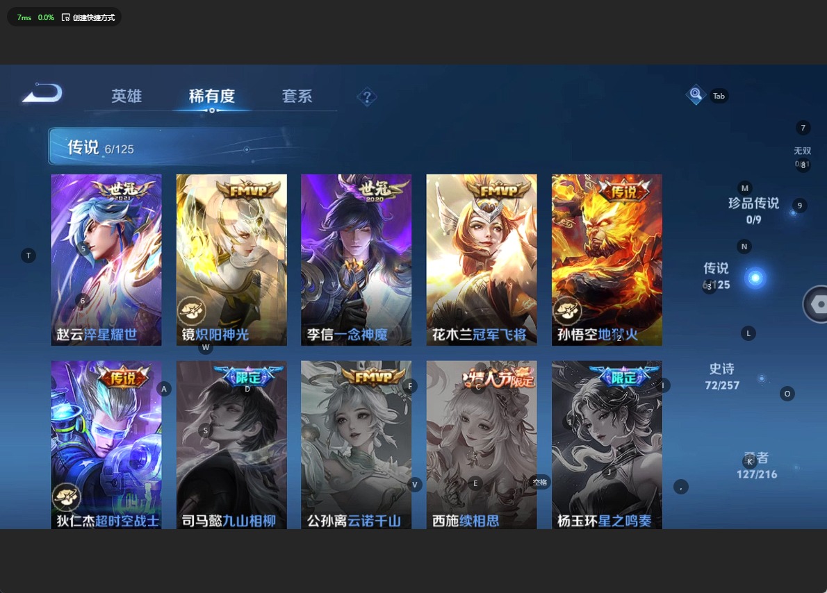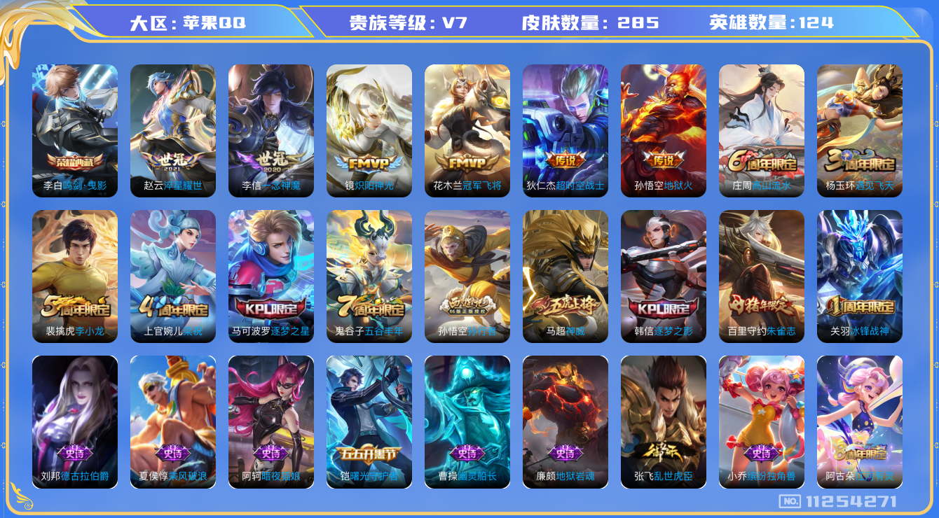 - [12256920]V7 1典藏 11传说 123英雄 188皮肤 可修改实名 优质装备:鸣剑·曳影,云鹰飞将(小将军),炽阳神光,一念神魔,无双飞将,碎云,山海·炽霜斩(李信年限),记忆之芯(机甲兔),澜逐花归海,涂山容容 传说皮:幻光神枪 珍宝阁皮:胡桃夹子,玩趣恶龙 限定皮:愿照·山河定(司空震年限),逐霄战戟,鸣野蒿,五谷丰年,李小龙,朱雀志(守约年限),时之祈愿-云中君,山海·玄木吟(马可年限) 史诗皮:星界战将,龙之律动,茶境仙,百相守梦-黄忠,黄金分割率,特工魅影,江河有灵,鹤归松栖(赵怀真),魅语,蒙恬荣光圣徽,电玩·爆裂旋风,暗夜猫娘,龙骑士(小龙虾),末日机甲-吕布,乱世虎臣,修罗,摇滚巨星,水果甜心,绅士熊喵,天才门将,星夜王子,德古拉伯爵,暗隐猎兽者,幽灵船长,鬼剑武藏,舞动绿茵,地狱岩魂,缤纷独角兽,乘风破浪,逐浪之夏,水晶猎龙者,曙光守护者,金属风暴,原初追逐者,圣诞狂欢,圣诞恋歌,鹰眼统帅,魅力维加斯,无心,未来纪元-赵云