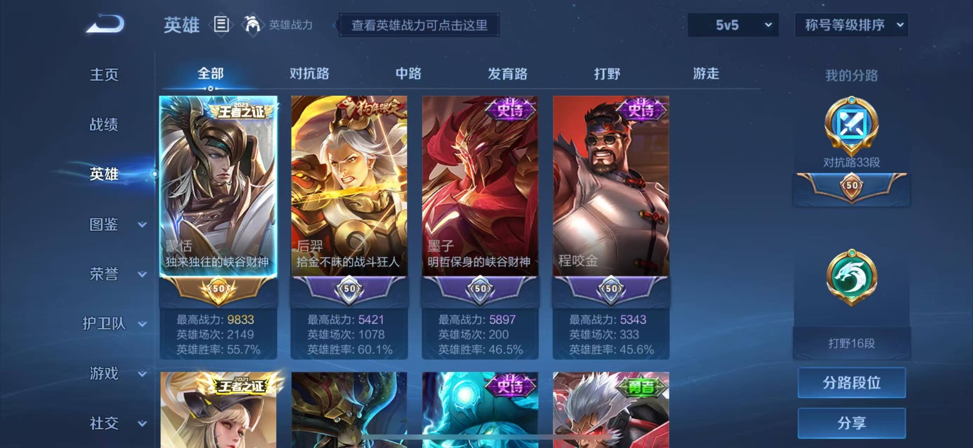 - [11935546]实名: 可修改 贵族等级: V7 英雄数: 118 皮肤数: 101 传说皮: 黄金狮子座,久胜战神,炽阳神光,一念神魔,地狱火,山海·炽霜斩 限定皮: 李小龙,时雨天司,太华,凤求凰,如梦令-后羿,山海·玄木吟