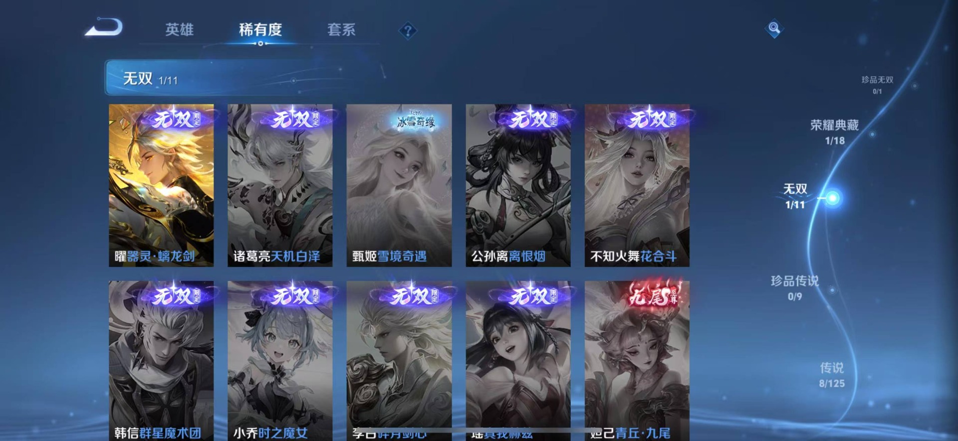 - [11381526]无双贵族 4典藏 2无双 8珍品传说 68传说 126英雄 532皮肤 典藏英雄武则天 可修改实名 优质装备:无限飓风号(高达),鸣剑·曳影,赤影疾锋,弑枪猎影(韩信典藏),碎月剑心(李白无双),天机白泽,江户川柯南,怪盗基德,酷洛米之心,大耳狗之梦,朽木白哉,黑崎一护,黄金狮子座,黄金射手座,云鹰飞将(小将军),绛天战甲(鸡嘴战神),黄金白羊座,猫影幻舞,久胜战神,炽阳神光,一念神魔,云霓雀翎,末日机甲-孙尚香(绿蚂蚱),地狱火,音你心动-小乔,零号·赤焰,海洋之心,地狱之眼,音你心动-周瑜,李逍遥,乞巧织情,时之恋人-刘备(电焊工),游龙清影(小青龙),淬星耀世,超时空战士-狄仁杰,末日机甲-孙策,挚爱之约,无双飞将,天秀幻梦,山海·炽霜斩(李信年限),山海·琳琅生(小乔年限),山海·苍雷引(电光曜子),燃星之曲,画中仙,浮生妄,百相守梦(张飞),鹤羽星尊,灼幽烈阳,妄想实况,惊梅引,澜逐花归海,艾琳觅芳踪,黄金天蝎座,牧神诗旅,玄雷天君 珍品传说:时之奇旅-孙策,兔狲·蓬尾 传说皮:乘龙·问璇玑(孙尚香年限),乘龙·铭钟鼎(赵云年限),乘龙·淬吴钩(孙策年限),落雪白狼,九山相柳,云诺千山,铠冥王哈迪斯,幻光神枪 珍宝阁皮:妄想食味,优雅恋人,蔷薇恋人,女武神 限定皮:愿照·九州拓(澜年限),愿照·山河定(司空震年限),愿照·众生和(妲己年限),愿照·千秋盛(女娲年限),逐霄战戟,映山客,陌上桑,鸣野蒿,夏侯惇霜北刀,至尊宝,太华(伽罗年限),傲雪梅枪,时之彼端,时雨天司(水龙头),飞衡(韩信年限),至美·乘鲤谣,遇见飞天,高山流水,诗剑行,齐天大圣,怒海麟威,降魔,五谷丰年,冰锋战神,幽恒(沐浴露),武圣,游园惊梦,梁祝,逐梦之翼,烈魂,天狼溯光者,奔雷神使(牛魔年限),李小龙,朱雀志(守约年限),永曜之星,辉光之辰,霸王别姬-项羽,圣诞老人,孙行者,猪悟能,大圣娶亲,天魔缭乱,青春决赛季,百木心枪,深海之息(深海大菠萝),时之奇旅-妲己,神器·万象笔,冰霜神祇 史诗皮:鸭鸭历险记-刘禅,苍鳞隐世,器灵·浮梦炉,糖绘人间,狼魂孤将,绮世丹青,瑰影绮梦,化蝶舞,灵蛊蚀心,星界战将,谪仙醉月,龙之律动,雪豹·霜爪,藏狐·褐绒,布丁狗之誓,小牛鸭,石田雨龙,百相守梦-周瑜,戍鼓铭心,茶境仙,幻珠鲛人,怒海争锋,炽弈燎原,撼地雄心,破空之剑,战舞者,涂山红红,东