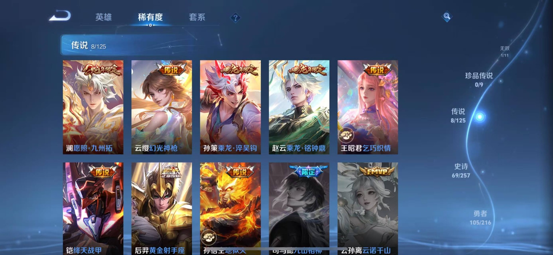 [11253680]V7 1典藏 1无双 8传说 125英雄 232皮肤 可修改实名 优质装备:星空梦想(太空人),器灵·螭龙剑,黄金射手座,绛天战甲(鸡嘴战神),地狱火,乞巧织情 传说皮:乘龙·铭钟鼎(赵云年限),乘龙·淬吴钩(孙策年限),幻光神枪 珍宝阁皮:优雅恋人,蔷薇恋人,女武神 限定皮:愿照·九州拓(澜年限),高山流水,五谷丰年,游园惊梦,梁祝,李小龙,辉光之辰,如梦令-后羿,孙行者 史诗皮:石田雨龙,紫霞仙子,电玩小子(小书包),黄金分割率,特工魅影,千年之狐,江河有灵,蒙恬荣光圣徽,偶像歌手,晚萤,无限星赏官,白蛇,电玩·爆裂旋风,龙骑士(小龙虾),末日机甲-吕布,猫狗日记-孙策,猫狗日记-大乔,节奏热浪,修罗,女仆咖啡,摇滚巨星,水果甜心,天才门将,星夜王子,心灵骇客,时之奇旅-安琪拉,功夫厨神,德古拉伯爵,暗隐猎兽者,幽灵船长,鬼剑武藏,心灵战警,舞动绿茵,地狱岩魂,拒霜思,缤纷独角兽,乘风破浪,逐浪之夏,水晶猎龙者,曙光守护者,金属风暴,原初追逐者,圣诞狂欢,圣诞恋歌,鹰眼统帅,魅力维加斯,黎明之约,无心,未来纪元-赵云