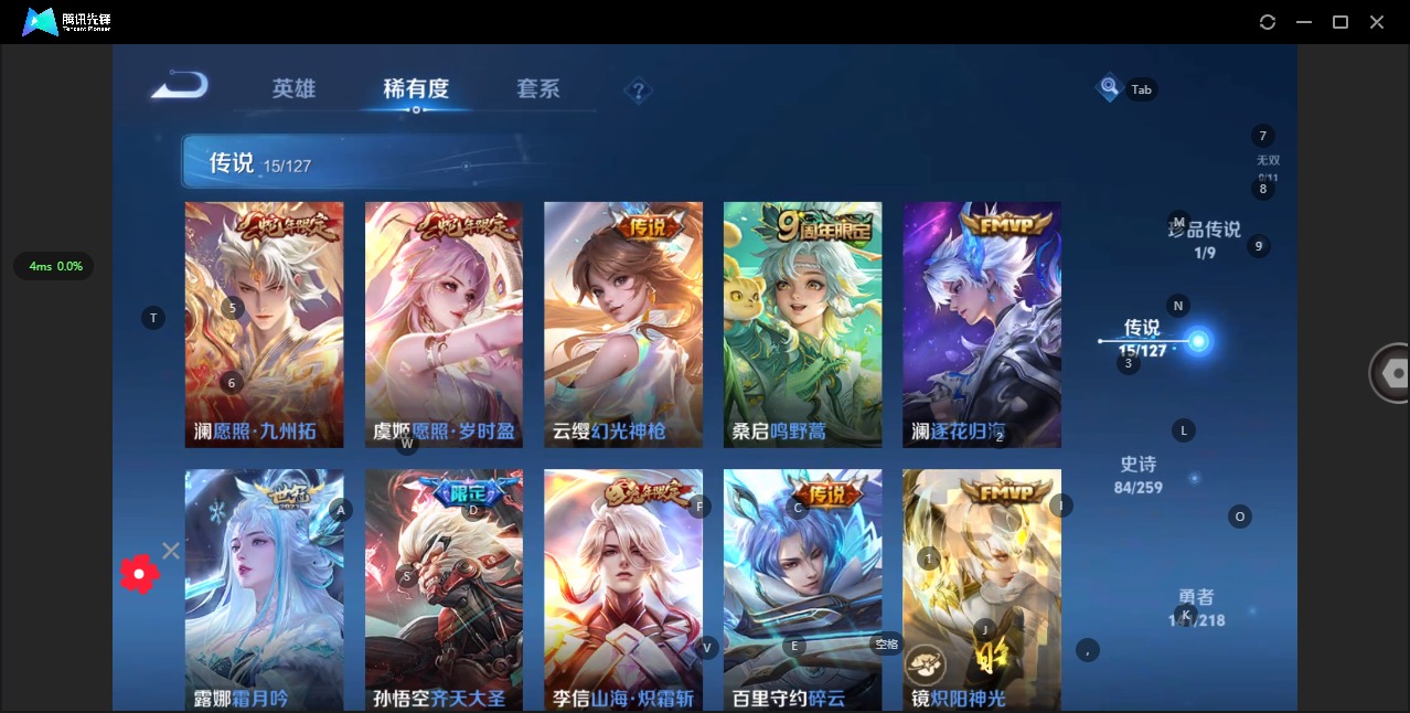 - [11443582]V7 1典藏 2珍品传说 8传说 124英雄 215皮肤 可修改实名 女号 优质装备:拾光映像(瑶典藏),器灵·落星盏,大耳狗之梦,黄金射手座,仲夏夜之梦(大飞蛾),乞巧织情,游龙清影(小青龙),花朝如约(花篮子),涂山容容 传说皮:续相思 珍宝阁皮:妄想食味,蔷薇恋人 限定皮:愿照·众生和(妲己年限),鸣野蒿,至美·乘鲤谣,梁祝,时之奇旅-妲己,神器·万象笔 史诗皮:鸭鸭历险记-刘禅,星界战将,龙之律动,百相守梦-周瑜,茶境仙,幻珠鲛人,破空之剑,涂山红红,蒙犽顽岩魄,上官婉儿群星魔术团,乘龙·忆丹青(大乔年限),百相守梦-黄忠,遇见神鹿,紫霞仙子,黄金分割率,江河有灵,白蛇,猫狗日记-大乔,女仆咖啡,水果甜心,绅士熊喵,心灵骇客,时之奇旅-安琪拉,功夫厨神,暗隐猎兽者,幽灵船长,鬼剑武藏,舞动绿茵,诗语江南,繁星吟游(呼啦呼啦),拒霜思,缤纷独角兽,乘风破浪,鹰眼统帅,魅力维加斯,未来纪元-赵云
