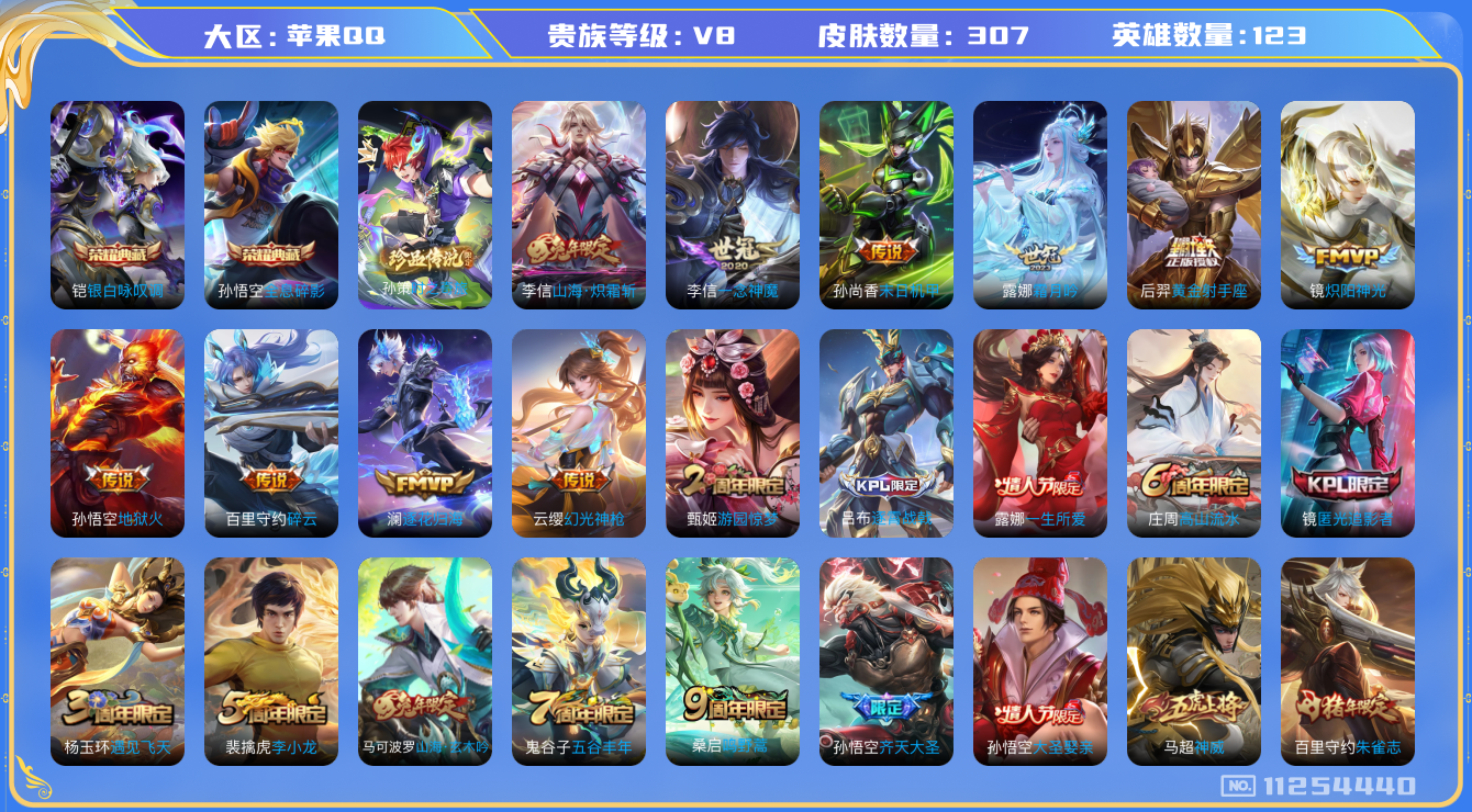 [11254440]V8 2典藏 1珍品传说 15传说 123英雄 307皮肤 可修改实名 优质装备:全息碎影(猴子典藏),银白咏叹调(倪克斯侍卫),黄金射手座,炽阳神光,一念神魔,末日机甲-孙尚香(绿蚂蚱),地狱火,碎云,山海·炽霜斩(李信年限),霜月吟,澜逐花归海 珍品传说:时之奇旅-孙策 传说皮:幻光神枪 珍宝阁皮:妄想食味,蔷薇恋人 限定皮:愿照·九州拓(澜年限),愿照·岁时盈(虞姬年限),逐霄战戟,鸣野蒿,神威(电光马子),遇见飞天,高山流水,齐天大圣,五谷丰年,游园惊梦,李小龙,朱雀志(守约年限),一生所爱,大圣娶亲,匿光追影者,山海·玄木吟(马可年限) 史诗皮:鸭鸭历险记-刘禅,狼魂孤将,绮世丹青,瑰影绮梦,化蝶舞,龙之律动,雪豹·霜爪,藏狐·褐绒,百相守梦-周瑜,茶境仙,百相守梦-百里守约,百相守梦-黄忠,紫霞仙子,苍穹之光,白龙吟,黄金分割率,特工魅影,匿光侦查者,江河有灵,蒙恬荣光圣徽,无限星赏官,冰冠公主,末日机甲-吕布,猫狗日记-大乔,乱世虎臣,节奏热浪,修罗,女仆咖啡,摇滚巨星,水果甜心,绅士熊喵,天才门将,星夜王子,心灵骇客,暗隐猎兽者,幽灵船长,鬼剑武藏,心灵战警,乐园奇幻夜,天秀·启明,舞动绿茵,地狱岩魂,纤云弄巧,拒霜思,缤纷独角兽,乘风破浪,逐浪之夏,水晶猎龙者,箭羽风息,金属风暴,圣诞恋歌,鹰眼统帅,暗夜贵公子,魅力维加斯,黎明之约,赏金猎手,奇遇舞章,无心,未来纪元-赵云