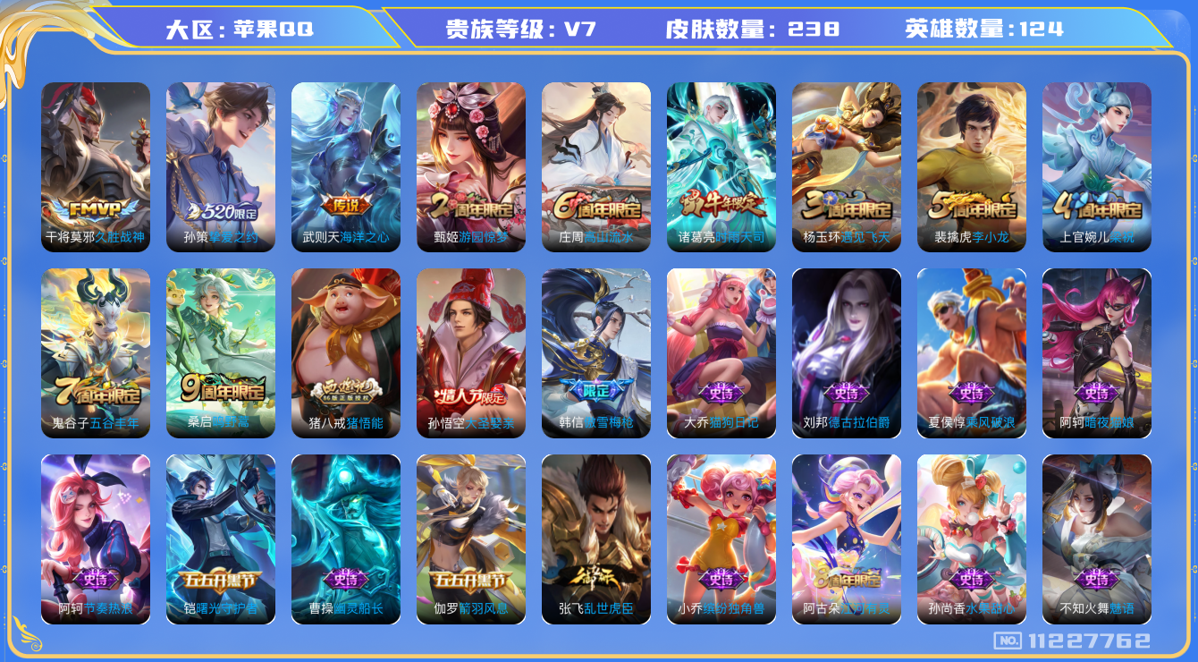[11227762]V7 5传说 124英雄 238皮肤 典藏英雄武则天 可修改实名 传说皮:海洋之心,久胜战神,挚爱之约 珍宝阁皮:优雅恋人,蔷薇恋人,女武神,玩趣恶龙 限定皮:鸣野蒿,傲雪梅枪,时雨天司(水龙头),遇见飞天,高山流水,五谷丰年,游园惊梦,梁祝,李小龙,猪悟能,大圣娶亲 史诗皮:星界战将,蒙犽顽岩魄,蔬乡物语(鲁班七号),紫霞仙子,苍穹之光,黄金分割率,特工魅影,千年之狐,江河有灵,蒙恬荣光圣徽,冰冠公主,偶像歌手,魅语,暗夜猫娘,龙骑士(小龙虾),末日机甲-吕布,猫狗日记-大乔,乱世虎臣,节奏热浪,女仆咖啡,水果甜心,绅士熊喵,天才门将,星夜王子,心灵骇客,功夫厨神,德古拉伯爵,暗隐猎兽者,幽灵船长,鬼剑武藏,心灵战警,舞动绿茵,纤云弄巧,缤纷独角兽,乘风破浪,逐浪之夏,水晶猎龙者,曙光守护者,箭羽风息,原初追逐者,圣诞狂欢,圣诞恋歌,鹰眼统帅,暗夜贵公子,魅力维加斯,黎明之约,无心,未来纪元-赵云
