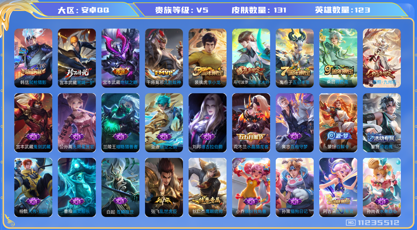 [11235512]V5 1典藏 1珍品传说 4传说 123英雄 131皮肤 可修改实名 优质装备:弑枪猎影(韩信典藏),黑崎一护,久胜战神,地狱之眼 珍宝阁皮:玩趣恶龙 限定皮:愿照·九州拓(澜年限),鸣野蒿,五谷丰年,李小龙,山海·玄木吟(马可年限) 史诗皮:苍鳞隐世,龙之律动,破空之剑,蒙犽顽岩魄,百相守梦-百里守约,百相守梦-黄忠,紫霞仙子,电玩小子(小书包),黄金分割率,江河有灵,百解令(蒙犽),无限星赏官,末日机甲-吕布,猫狗日记-孙策,乱世虎臣,水果甜心,德古拉伯爵,暗隐猎兽者,幽灵船长,鬼剑武藏,天秀·启明,舞动绿茵,拒霜思,缤纷独角兽,逐浪之夏,水晶猎龙者,鹰眼统帅,魅力维加斯,未来纪元-赵云