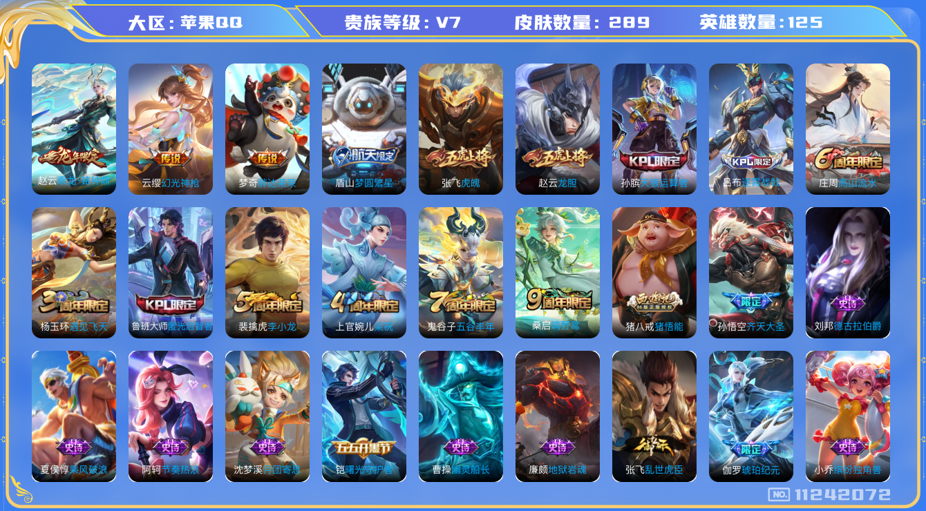 [11242072]V7 5传说 125英雄 289皮肤 可修改实名 传说皮:乘龙·铭钟鼎(赵云年限),幻光神枪,胖达荣荣 珍宝阁皮:优雅恋人,蔷薇恋人,女武神 限定皮:逐霄战戟,鸣野蒿,遇见飞天,高山流水,齐天大圣,五谷丰年,天狼运算者,梁祝,龙胆,虎魄,李小龙,猪悟能,匿光启智者,梦圆繁星 史诗皮:鸭鸭历险记-刘禅,龙之律动,石田雨龙,蔬乡物语(鲁班七号),琥珀纪元伽罗,紫霞仙子,电玩小子(小书包),特工魅影,千年之狐,电玩·爆裂旋风,江河有灵,百解令(蒙犽),蒙恬荣光圣徽,偶像歌手,末日机甲-吕布,猫狗日记-孙策,乱世虎臣,节奏热浪,修罗,女仆咖啡,水果甜心,绅士熊喵,天才门将,星夜王子,心灵骇客,功夫厨神,德古拉伯爵,暗隐猎兽者,幽灵船长,鬼剑武藏,心灵战警,乐园奇幻夜,舞动绿茵,地狱岩魂,纤云弄巧,繁星吟游(呼啦呼啦),拒霜思,缤纷独角兽,乘风破浪,逐浪之夏,月团寄思,水晶猎龙者,曙光守护者,金属风暴,原初追逐者,圣诞狂欢,鹰眼统帅,魅力维加斯,黎明之约,无心