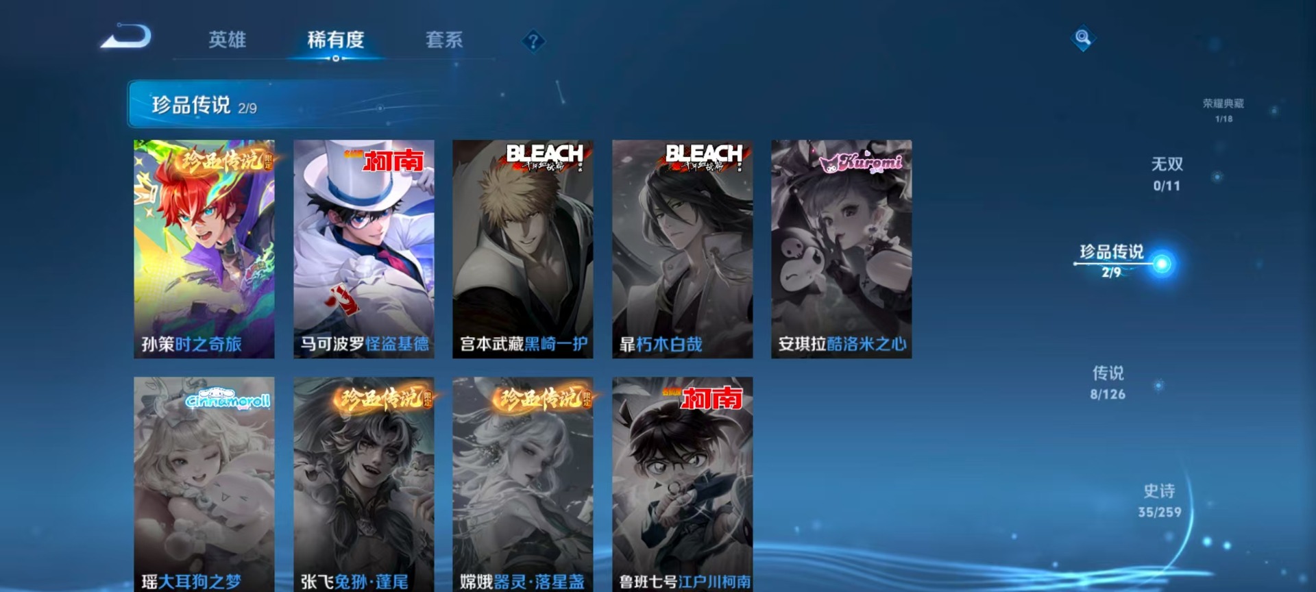 - PX_2094338-安卓QQ 249皮 贵族9级 1典藏 2珍品传说 1无双 30传说 69史诗【荣耀典藏】弑枪猎影【珍品传说】怪盗基德,江户川柯南【无双限定】器灵·螭龙剑【传说皮肤】绯月行,时之恋人,黄金射手座,前尘镜,末日机甲,地狱火,齐天大圣,挚爱之约,地狱之眼,李逍遥 ,山海·苍雷引,云鹰飞将,山海·炽霜斩,一念神魔,飞鸢探春,诗剑行,鸣野蒿,胖达荣荣,枫霜尽,神器·狴犴令,超时空战士,