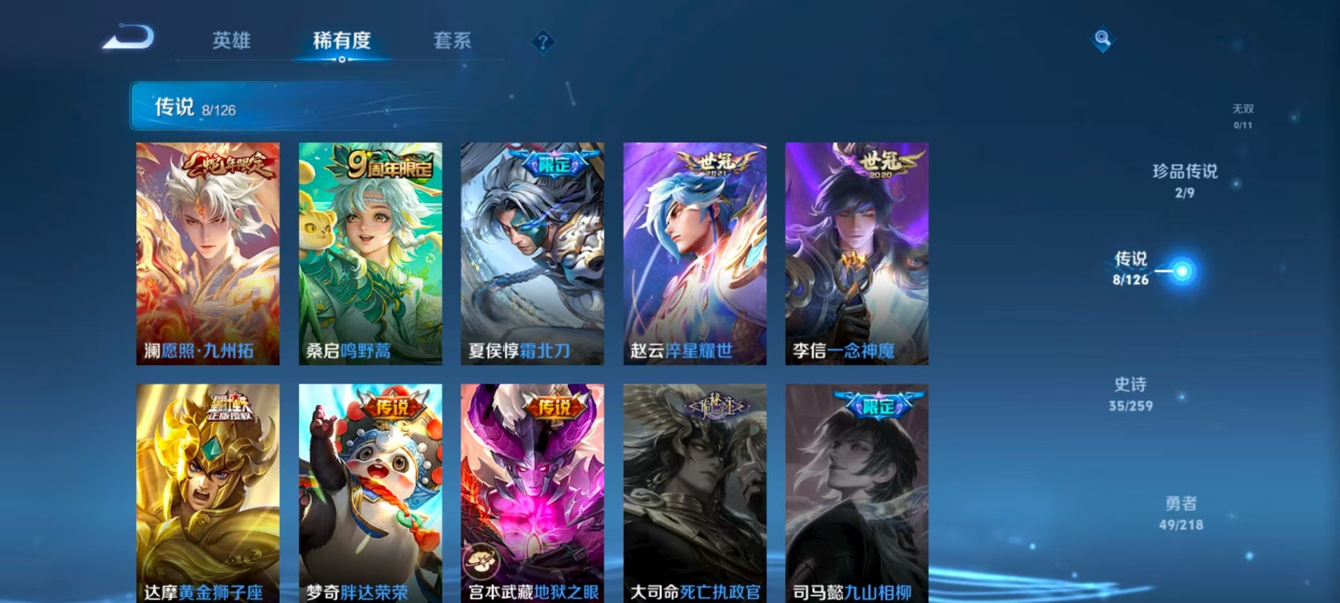 - [11868181]V8 1典藏 17传说 125英雄 277皮肤 可修改实名 优质装备:神鉴启示录,黄金狮子座,黄金射手座,冠军飞将,云鹰飞将(小将军),一念神魔,地狱火,胖达荣荣,时之恋人-刘备(电焊工),遇见胡旋,浮生妄,妄想奇谈 传说皮:幻光神枪 珍宝阁皮:妄想食味,胡桃夹子,蔷薇恋人,女武神 限定皮:至尊宝,白虎志(电光耗子),太华(伽罗年限),异界灵契(白毛香),时之彼端,时雨天司(水龙头),神威(电光马子),飞衡(韩信年限),高山流水,五谷丰年,冰锋战神,幽恒(沐浴露),岱宗(典韦年限),天狼绘梦者,李小龙,朱雀志(守约年限),如梦令-嫦娥,如梦令-后羿,真爱至上,孙行者,猪悟能,大圣娶亲,青春决赛季,冰霜恋舞曲,神奇女侠,匿光追影者,山海·玄木吟(马可年限) 史诗皮:石田雨龙,千年之狐,高渐离燃音魔法,蒙恬荣光圣徽,冰冠公主,电玩·爆裂旋风,百相守梦(关羽),末日机甲-吕布,猫狗日记-孙策,猫狗日记-大乔,乱世虎臣,修罗,摇滚巨星,水果甜心,天才门将,时之奇旅-安琪拉,功夫厨神,德古拉伯爵,暗隐猎兽者,鬼剑武藏,心灵战警,舞动绿茵,纤云弄巧,繁星吟游(呼啦呼啦),拒霜思,乘风破浪,逐浪之夏,水晶猎龙者,曙光守护者,金属风暴,原初追逐者,鹰眼统帅,王者之锤,魅力维加斯,黎明之约,无心,未来纪元-赵云