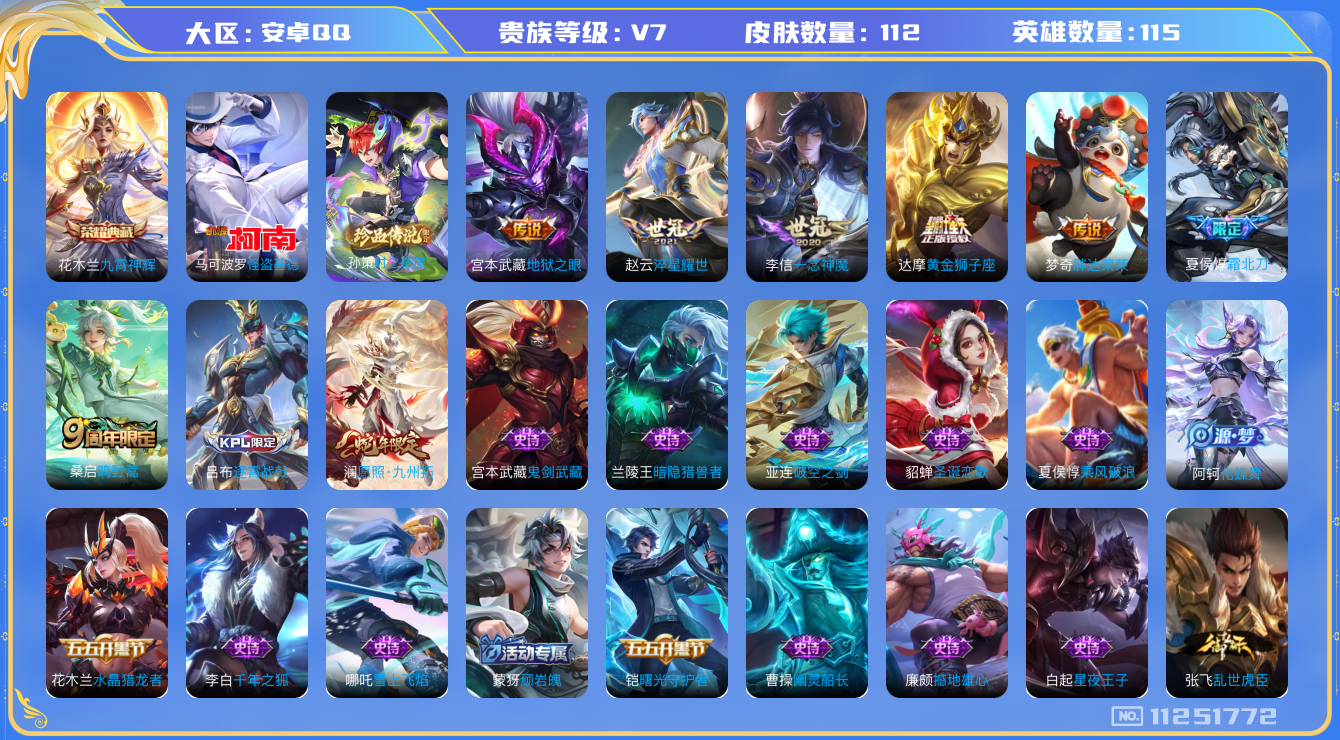 [11251772]V7 1典藏 2珍品传说 8传说 115英雄 112皮肤 可修改实名 优质装备:九霄神辉(木兰典藏),怪盗基德,黄金狮子座,一念神魔,地狱之眼,胖达荣荣,淬星耀世 珍品传说:时之奇旅-孙策 限定皮:愿照·九州拓(澜年限),逐霄战戟,鸣野蒿,夏侯惇霜北刀 史诗皮:器灵·浮梦炉,化蝶舞,撼地雄心,破空之剑,东方月初,蒙犽顽岩魄,埋骨钱,蔬乡物语(鲁班七号),苍穹之光,黄金分割率,千年之狐,冰冠公主,猫狗日记-孙策,乱世虎臣,水果甜心,绅士熊喵,天才门将,星夜王子,暗隐猎兽者,幽灵船长,鬼剑武藏,暗渊魔法,乘风破浪,水晶猎龙者,曙光守护者,圣诞狂欢,圣诞恋歌,鹰眼统帅,魅力维加斯,雪上飞焰