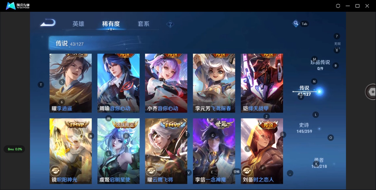 - [12287307]V8 1典藏 2珍品传说 23传说 125英雄 302皮肤 可修改实名 优质装备:弑枪猎影(韩信典藏),酷洛米之心,大耳狗之梦,黄金狮子座,云鹰飞将(小将军),炽阳神光,一念神魔,仲夏夜之梦(大飞蛾),地狱之眼,乞巧织情,时之恋人-刘备(电焊工),超时空战士-狄仁杰,无双飞将,山海·炽霜斩(李信年限),妄想实况,鹤归松栖(云缨),遇见神鼓,鲁班七号-时之奇旅,小动物乐团 传说皮:乘龙·问璇玑(孙尚香年限),落雪白狼,云诺千山,祥瑞亨通 珍宝阁皮:妄想食味,胡桃夹子 限定皮:逐霄战戟,陌上桑,鸣野蒿,至尊宝,山海·碧波行(瑶年限),武圣,梁祝,李小龙,冰霜恋舞曲,匿光启智者 史诗皮:鸭鸭历险记-刘禅,龙之律动,星界战将,石田雨龙,百相守梦-周瑜,百相守梦-黄忠,埋骨钱,谪仙醉月,星界特工,炽弈燎原,撼地雄心,破空之剑,怒海争锋,蔬乡物语(鲁班七号),百相守梦-百里守约,紫霞仙子,黄金分割率,特工魅影,千年之狐,永昼,冰冠公主,浮梦罗烟,鹤归松栖(赵怀真),江河有灵,百解令(蒙犽),高渐离燃音魔法,魅语,无限星赏官,晚萤,偶像歌手,银翎春语,龙骑士(小龙虾),暗夜猫娘,末日机甲-吕布,猫狗日记-孙策,猫狗日记-大乔,乱世虎臣,节奏热浪,修罗,女仆咖啡,摇滚巨星,水果甜心,绅士熊喵,天才门将,星夜王子,心灵骇客,功夫厨神,德古拉伯爵,暗隐猎兽者,幽灵船长,鬼剑武藏,暗渊魔法,心灵战警,乐园奇幻夜,天秀·启明,舞动绿茵,地狱岩魂,诗语江南,拒霜思,缤纷独角兽,乘风破浪,逐浪之夏,水晶猎龙者,曙光守护者,热力回旋,箭羽风息,金属风暴,原初追逐者,圣诞狂欢,圣诞恋歌,鹰眼统帅,暗夜贵公子,魅力维加斯,黎明之约,赏金猎手,未来纪元-赵云