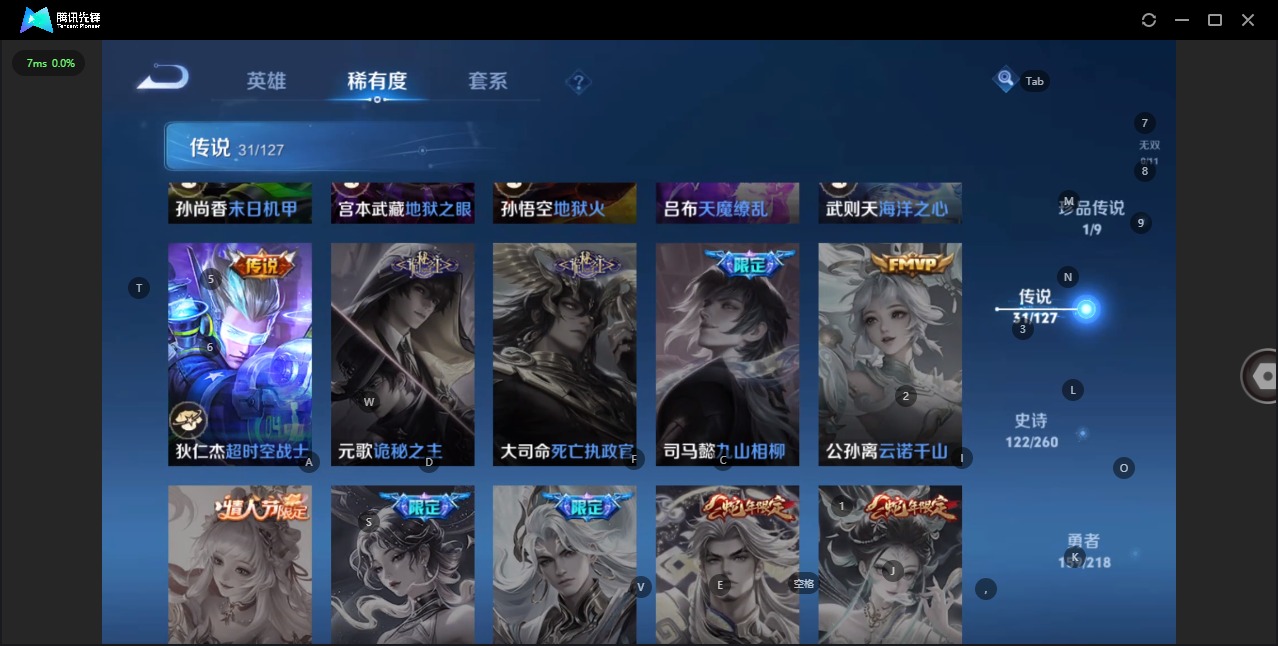 - [11866529]V9 2典藏 33传说 125英雄 462皮肤 可修改实名 优质装备:鸣剑·曳影,拾光映像(瑶典藏),黄金射手座,云鹰飞将(小将军),绛天战甲(鸡嘴战神),久胜战神,炽阳神光,末日机甲-孙尚香(绿蚂蚱),仲夏夜之梦(大飞蛾),音你心动-小乔,胖达荣荣,李逍遥,超时空战士-狄仁杰,碎云,浮生妄,鹤羽星尊,妄想奇谈,黄金天蝎座,千山共赴,涂山容容 传说皮:云诺千山,铠冥王哈迪斯,续相思,星之鸣奏,祥瑞亨通,幻光神枪 珍宝阁皮:妄想食味,胡桃夹子,女武神 限定皮:愿照·九州拓(澜年限),愿照·山河定(司空震年限),愿照·千秋盛(女娲年限),逐霄战戟,鸣野蒿,至尊宝,凤求凰(白切鸡),凤凰于飞,傲雪梅枪,绯月行,魔法小厨娘,时雨天司(水龙头),神威(电光马子),飞衡(韩信年限),遇见飞天,高山流水,诗剑行,降魔,五谷丰年,天狼运算者,梁祝,御风骁将(吕布年限),龙胆,烈魂,天狼溯光者,逐梦之音,祈雪灵祝(雪兔子),天狼绘梦者,李小龙,逐梦之影,朱雀志(守约年限),孙行者,猪悟能,大圣娶亲,引擎之心,青春决赛季,乒乒小将,蜜橘之夏,玉兔公主,时之奇旅-妲己,神器·万象笔 史诗皮:鸭鸭历险记-刘禅,苍鳞隐世,器灵·浮梦炉,糖绘人间,绮世丹青,瑰影绮梦,化蝶舞,灵蛊蚀心,星界战将,龙之律动,雪豹·霜爪,藏狐·褐绒,布丁狗之誓,百相守梦-周瑜,戍鼓铭心,茶境仙,怒海争锋,破空之剑,涂山红红,东方月初,蒙犽顽岩魄,芈月浮光幕影,琥珀纪元伽罗,上官婉儿群星魔术团,蔬乡物语(鲁班七号),超元猎域,百相守梦-百里守约,星界特工,百相守梦-黄忠,织梦人,紫霞仙子,苍穹之光,电玩小子(小书包),白龙吟,黄金分割率,特工魅影,千年之狐,江河有灵,鹤归松栖(赵怀真),真我赫兹(百里守约),魅语,百解令(蒙犽),高渐离燃音魔法,蒙恬荣光圣徽,无限星赏官,冰冠公主,青蛇,偶像歌手,白蛇,晚萤,电玩·爆裂旋风,暗夜猫娘,末日机甲-吕布,猫狗日记-孙策,猫狗日记-大乔,时之恋人-孙尚香,乱世虎臣,节奏热浪,修罗,女仆咖啡,摇滚巨星,水果甜心,绅士熊喵,天才门将,星夜王子,心灵骇客,功夫厨神,德古拉伯爵,暗隐猎兽者,幽灵船长,鬼剑武藏,暗渊魔法,心灵战警,乐园奇幻夜,天秀·启明,舞动绿茵,地狱岩魂,诗语江南,纤云弄巧,繁星吟游(呼啦呼啦),拒霜思,缤纷独角兽,乘风破浪,逐浪之夏,龙鼓争鸣,月团寄思,水晶猎