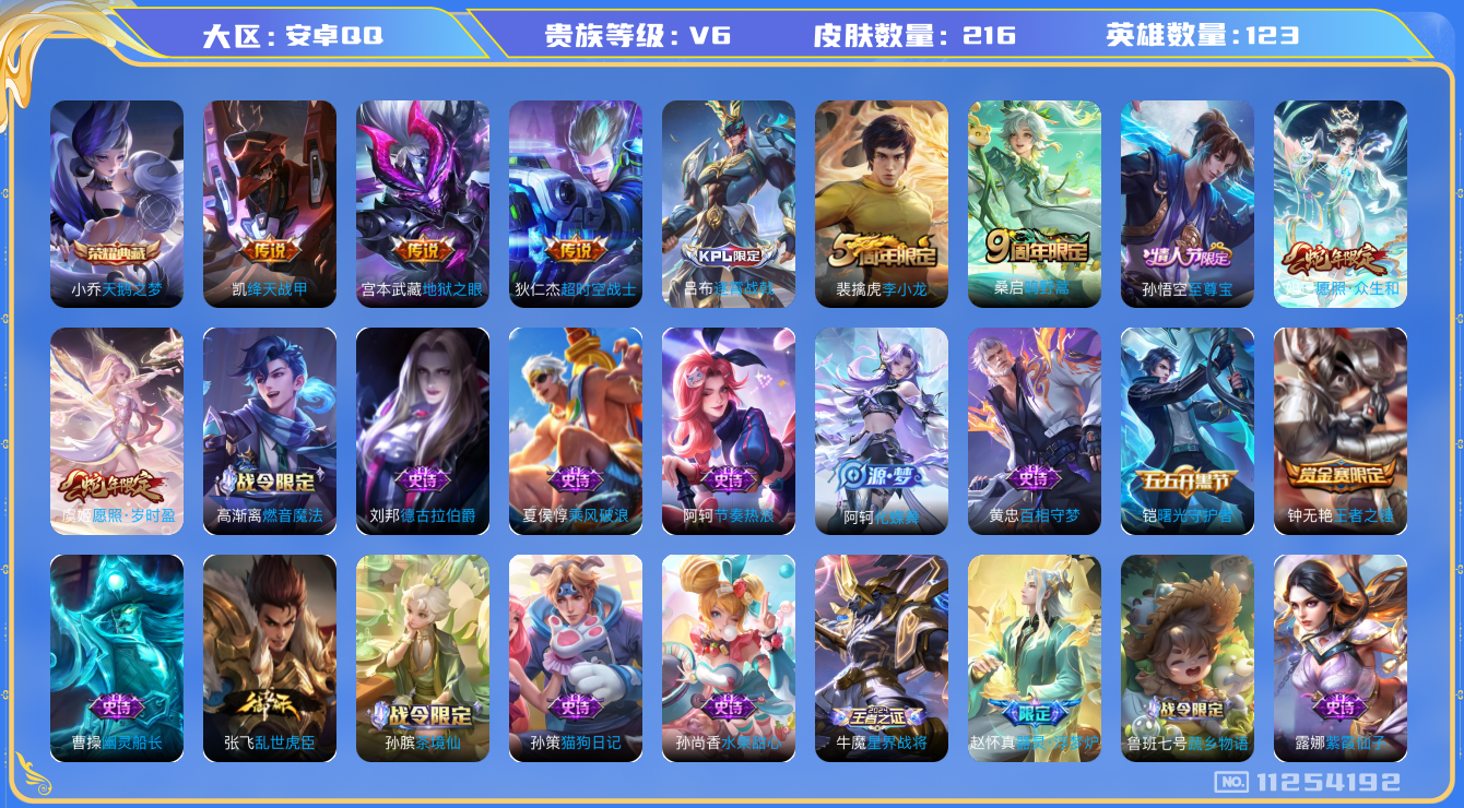 [11254192]V6 1典藏 6传说 123英雄 216皮肤 可修改实名 优质装备:天鹅之梦(小乔典藏),绛天战甲(鸡嘴战神),地狱之眼,超时空战士-狄仁杰 珍宝阁皮:万物之道,玩趣恶龙 限定皮:愿照·岁时盈(虞姬年限),愿照·众生和(妲己年限),逐霄战戟,鸣野蒿,至尊宝,李小龙 史诗皮:器灵·浮梦炉,化蝶舞,星界战将,龙之律动,百相守梦-周瑜,茶境仙,破空之剑,战舞者,蒙犽顽岩魄,谪仙醉月,蔬乡物语(鲁班七号),百相守梦-百里守约,百相守梦-黄忠,紫霞仙子,特工魅影,高渐离燃音魔法,冰冠公主,末日机甲-吕布,猫狗日记-孙策,乱世虎臣,节奏热浪,修罗,女仆咖啡,水果甜心,星夜王子,心灵骇客,功夫厨神,德古拉伯爵,幽灵船长,鬼剑武藏,暗渊魔法,乐园奇幻夜,纤云弄巧,繁星吟游(呼啦呼啦),乘风破浪,逐浪之夏,水晶猎龙者,曙光守护者,原初追逐者,鹰眼统帅,王者之锤