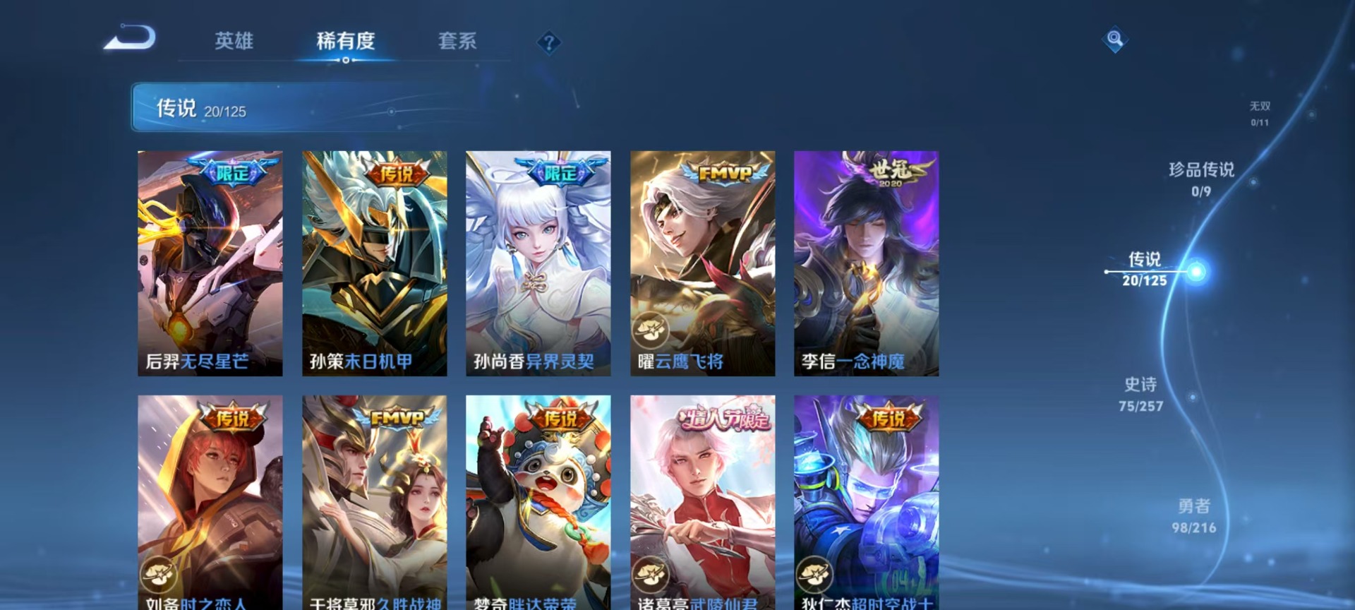 盾山梦圆繁星,铠青龙志,伽罗天狼溯光者,孙尚香异界灵契,后羿无尽星芒,吕布御风骁将,后羿如梦令,镜匿光追影者,裴擒虎李小龙,上官婉儿梁祝,马可波罗山海·玄木吟,马可波罗深海之息,桑启鸣野蒿,孙悟空孙行者,赵云引擎之心,百里守约朱雀志,澜愿照·九州拓,橘右京枫霜尽