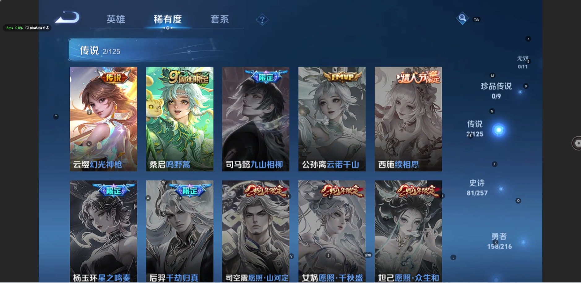 - [11632816]V7 1典藏 5传说 124英雄 290皮肤 可修改实名 优质装备:赤影疾锋,云霓雀翎,地狱火,乞巧织情 传说皮:乘龙·铭钟鼎(赵云年限) 珍宝阁皮:妄想食味,蔷薇恋人,女武神 限定皮:鸣野蒿,高山流水,五谷丰年,梁祝,龙胆,李小龙,玄武志(苏烈年限),孙行者,猪悟能,大圣娶亲 史诗皮:化蝶舞,星界战将,石田雨龙,紫霞仙子,苍穹之光,黄金分割率,特工魅影,千年之狐,永昼,百解令(蒙犽),蒙恬荣光圣徽,无限星赏官,冰冠公主,青蛇,电玩·爆裂旋风,暗夜猫娘,龙骑士(小龙虾),末日机甲-吕布,猫狗日记-孙策,猫狗日记-大乔,乱世虎臣,节奏热浪,修罗,女仆咖啡,摇滚巨星,水果甜心,绅士熊喵,星夜王子,心灵骇客,功夫厨神,暗隐猎兽者,幽灵船长,鬼剑武藏,心灵战警,舞动绿茵,地狱岩魂,诗语江南,纤云弄巧,繁星吟游(呼啦呼啦),拒霜思,缤纷独角兽,乘风破浪,逐浪之夏,水晶猎龙者,曙光守护者,箭羽风息,金属风暴,原初追逐者,圣诞狂欢,圣诞恋歌,鹰眼统帅,魅力维加斯,黎明之约,无心,未来纪元-赵云